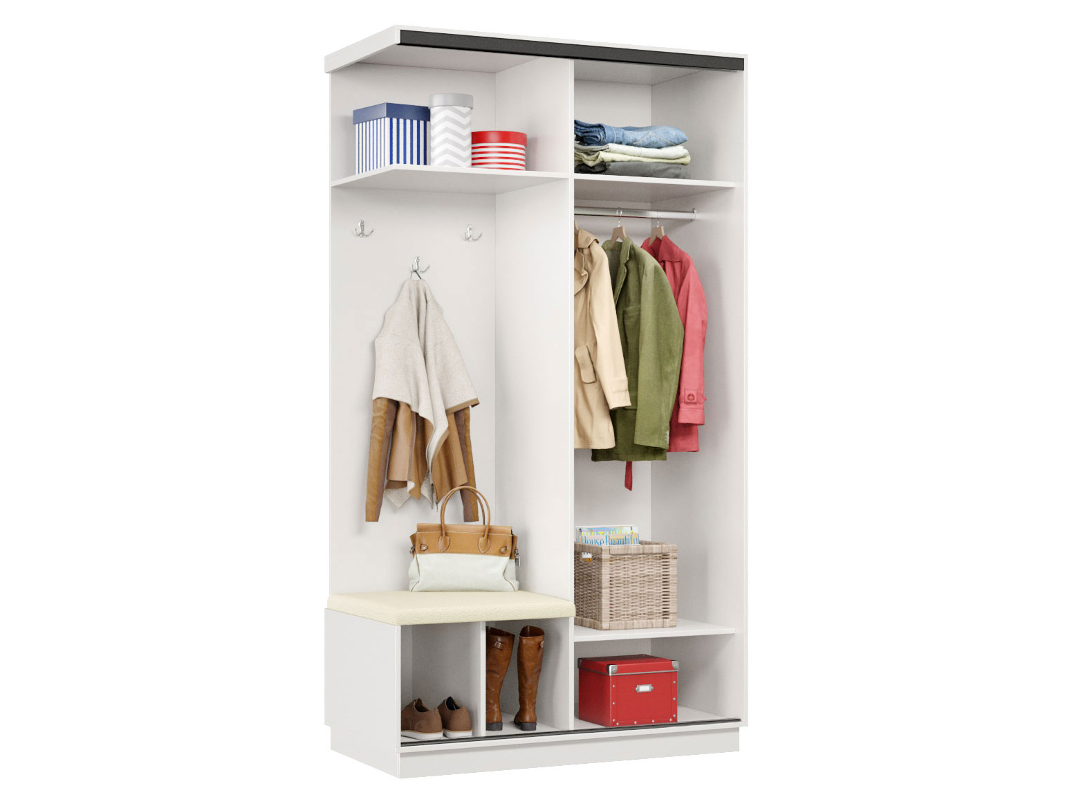 • Прихожая Маршал 01 с мягким сиденьем обеспечит порядок и рациональное хранение вещей в небольшом пространстве. Модель включает открытую вешалку и отделение с полками, чтобы быстро находить верхнюю одежду и нужную пару обуви. Дверь с полноразмерным зеркалом плавно перемещается, поочередно открывая каждую из секций.