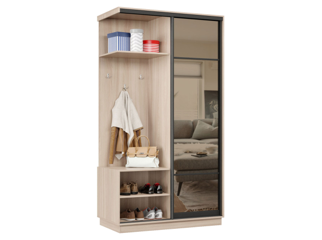 • Прихожая Маршал 11 Стандарт поможет обустроить функциональное входное пространство в малогабаритной квартире. Отделение с полками и крючками позволит аккуратно распределить повседневную одежду, обувь и аксессуары. В отделении с раздвижной дверцей удобно хранить сезонные предметы гардероба. Зеркальный фасад дает возможность в деталях оценить подобранный образ и визуально расширяет помещение.