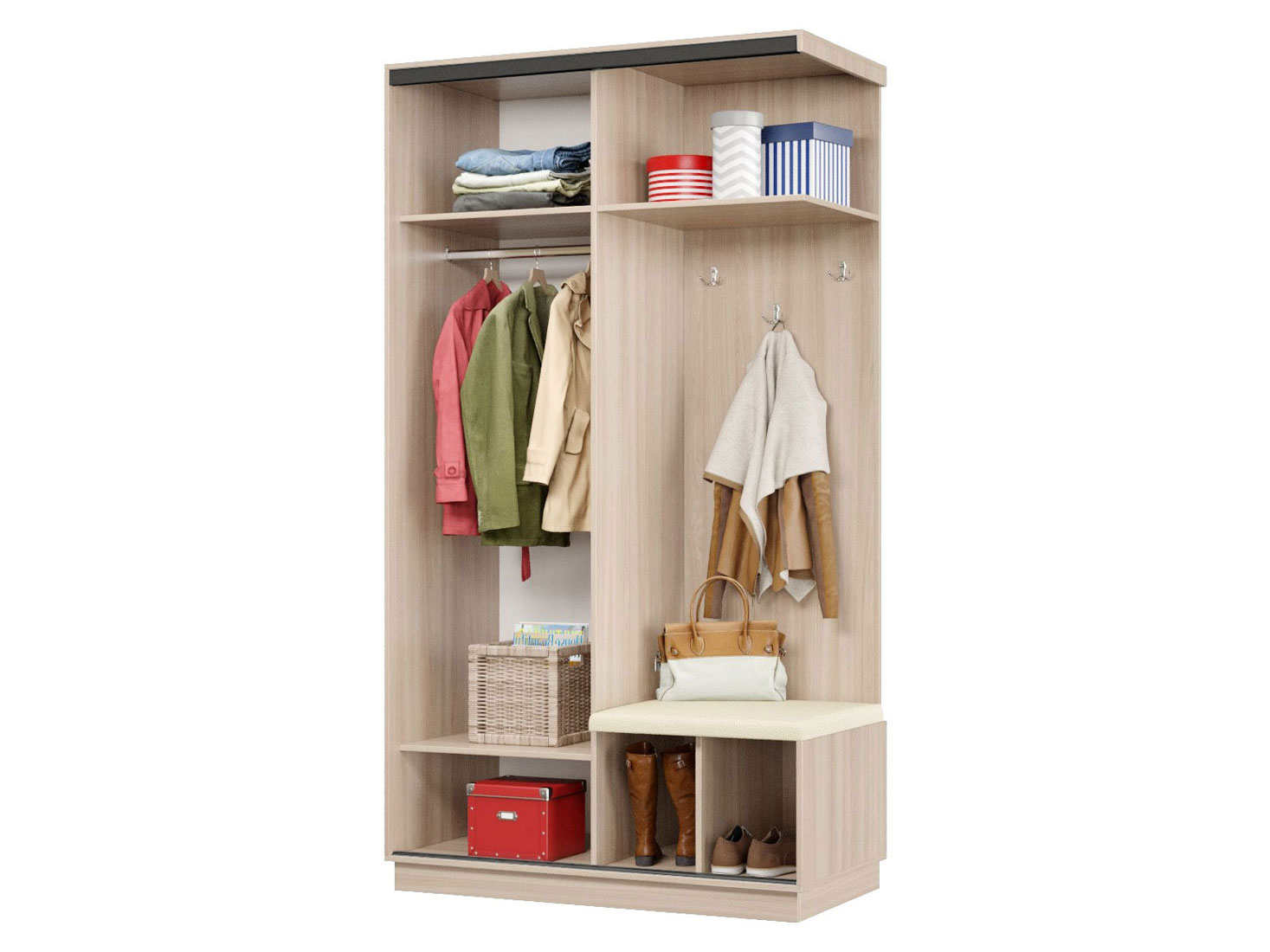 • Прихожая Маршал 11 с мягким сиденьем сочетает стильный дизайн и практичность. Открытые элементы включают зону с тремя крючками для одежды и верхнюю полку для хранения аксессуаров. Под мягким сиденьем расположены две открытые ниши для обуви. Зеркальная дверь визуально увеличивает пространство и позволяет оценить свой внешний вид.