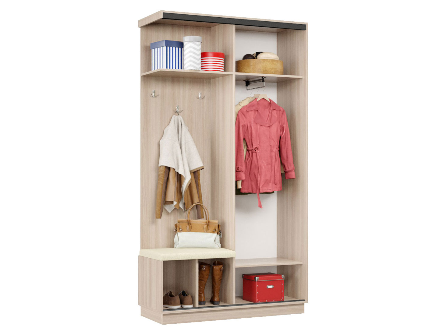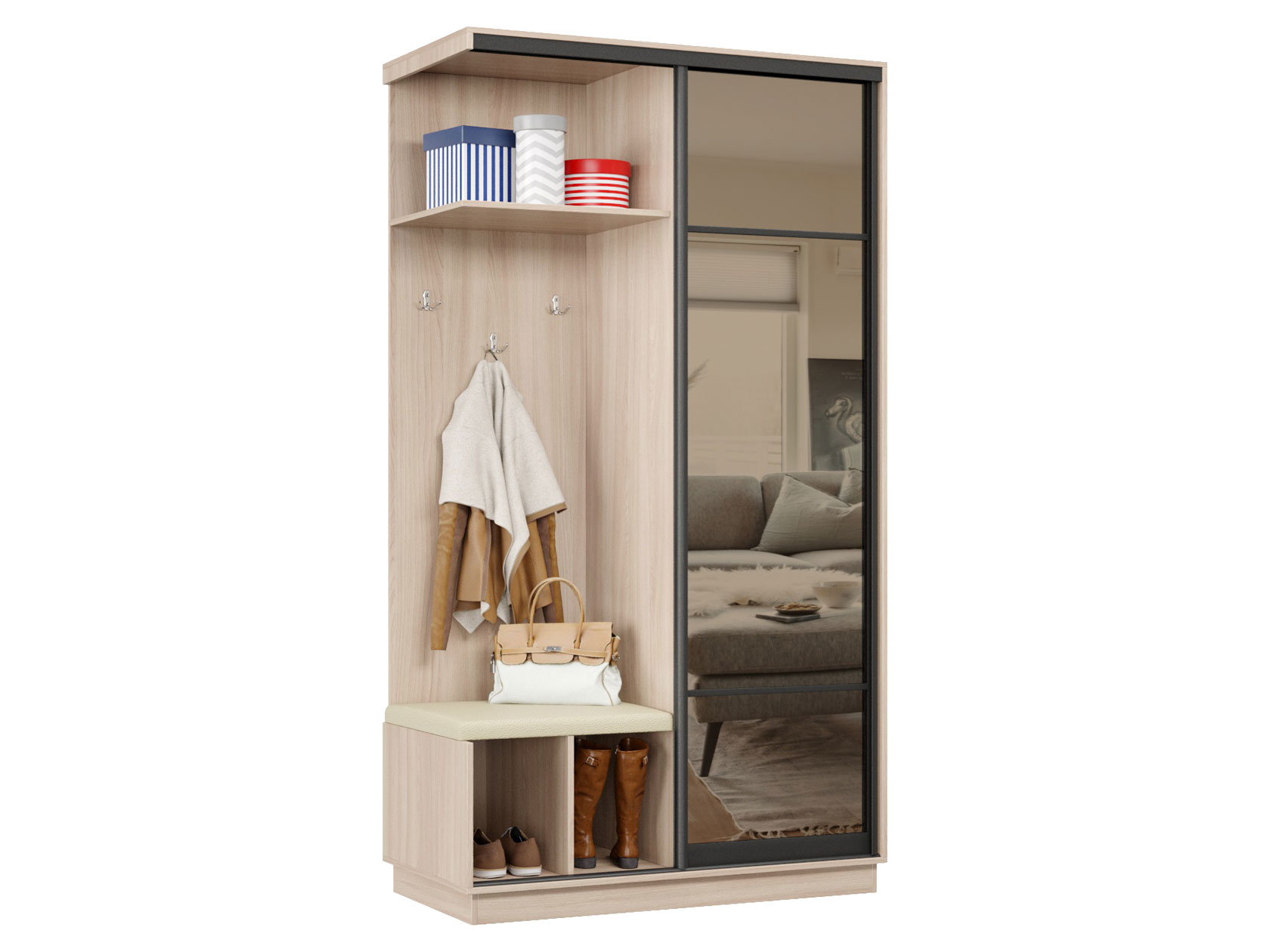 • Прихожая Маршал 11 с мягким сиденьем сочетает стильный дизайн и практичность. Открытые элементы включают зону с тремя крючками для одежды и верхнюю полку для хранения аксессуаров. Под мягким сиденьем расположены две открытые ниши для обуви. Зеркальная дверь визуально увеличивает пространство и позволяет оценить свой внешний вид.