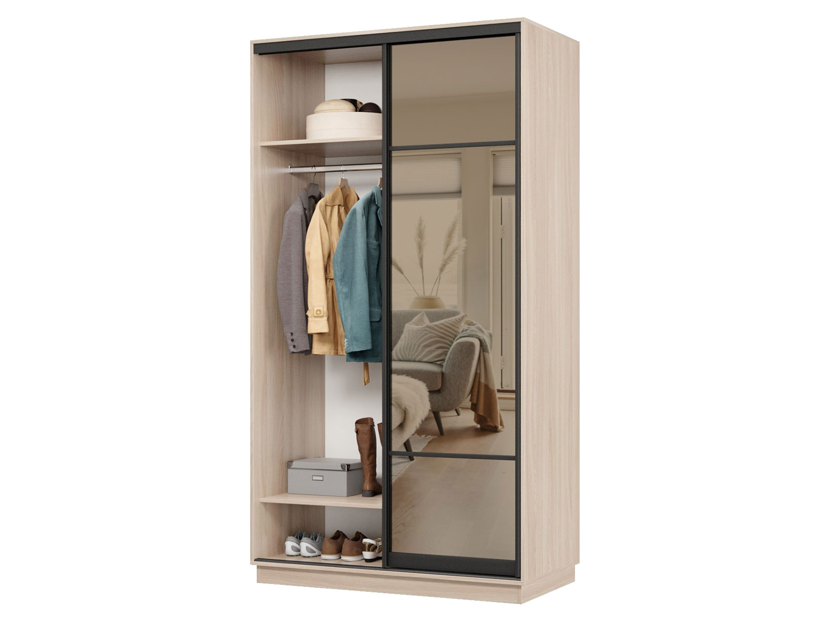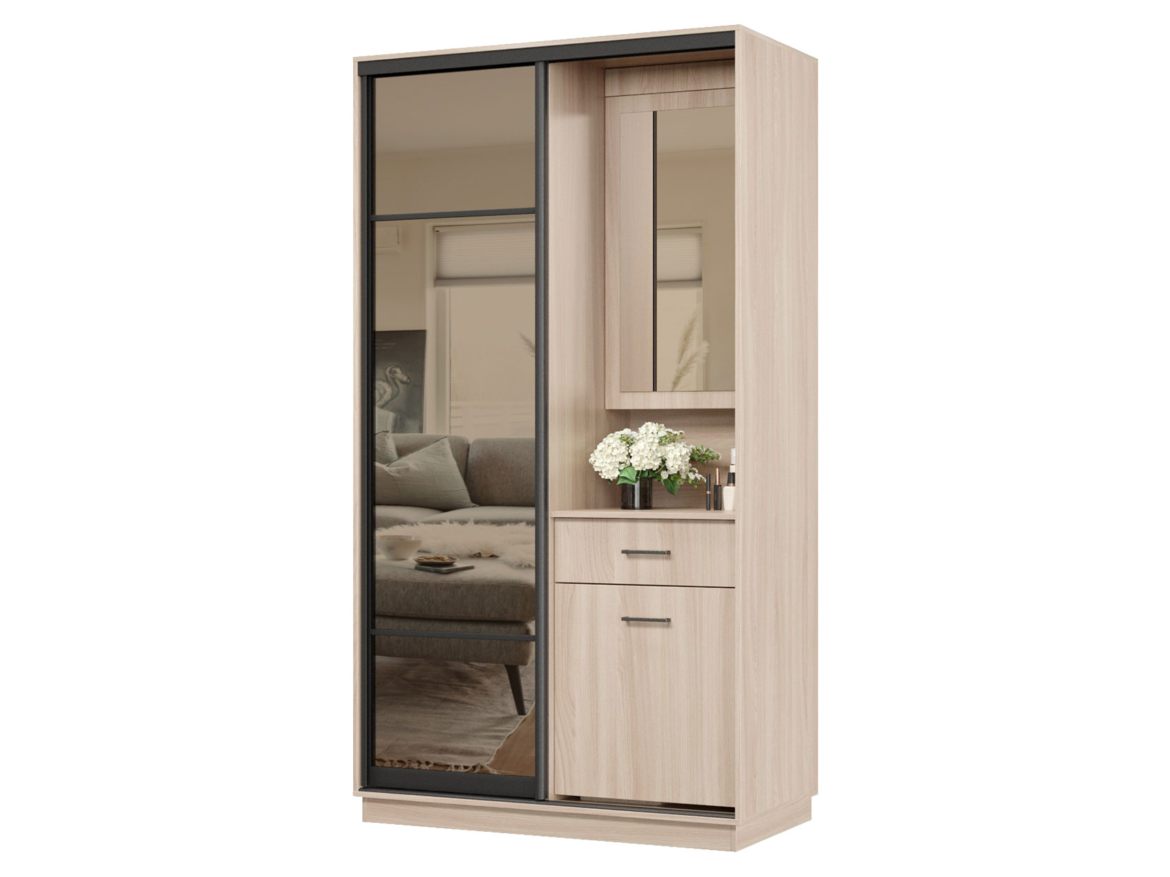Прихожая Маршал 11 Комби идеально подходит для небольшого пространства, обеспечивая достаточно места для хранения одежды и обуви. За небольшим зеркалом скрыто отделение с нишами для косметики и парфюмерии. В выдвижном ящике удобно держать ключи и полезные мелочи. Тумба с полками послужит обувницей. Раздвижная дверь оснащена высоким зеркалом, которое незаменимо перед выходом из дома.