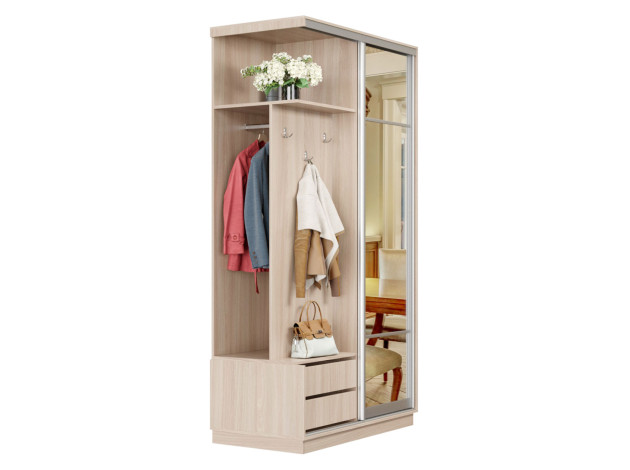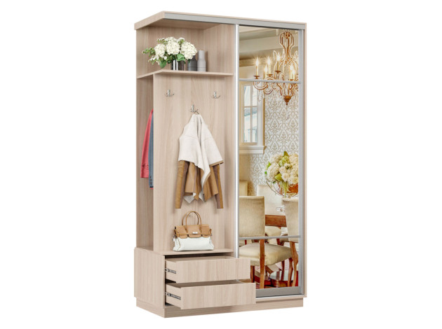 • Прихожая Маршал станет практичным решением для обустройства небольшой входной зоны. За раздвижным фасадом предусмотрены вместительное отделение с полками для головных уборов и обуви. Распашная дверца, дополненная зеркальным полотном, скрывает ряд полок для хранения. Выдвижной ящик подойдет для быстрого доступа к полезным мелочам.