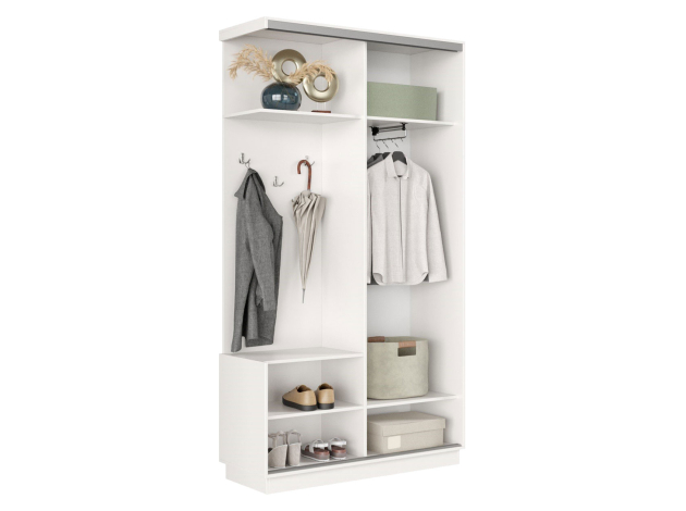 • Прихожая Маршал станет отличным решением для меблировки небольшого помещения. Конструкция поделена на две равные по размеру секции: отделение со штангой для вешалок и нишу с полками и крючками для верхней одежды. Отличительная черта модели — дверь, которая перемещается по однополосному треку вправо или влево, поочередно открывая и закрывая каждую из секций, что важно для узкого коридора.