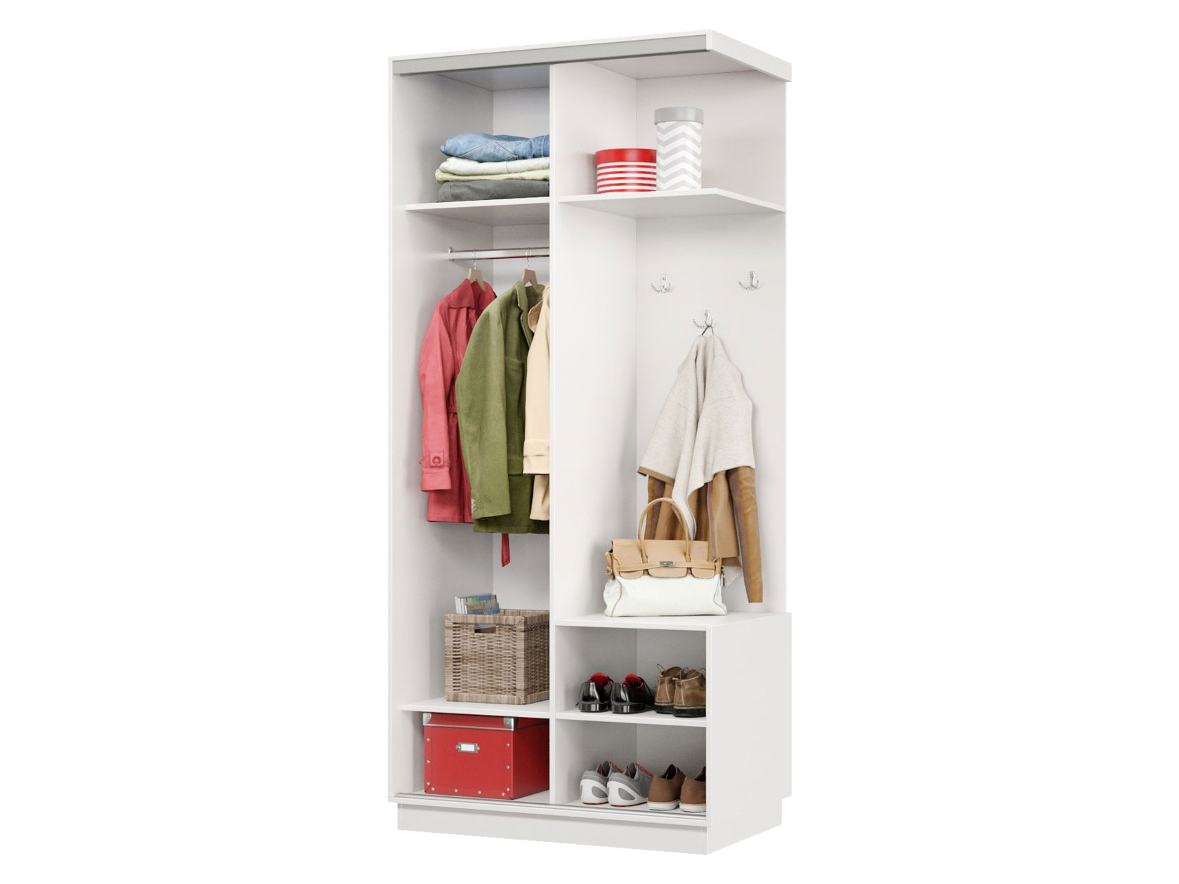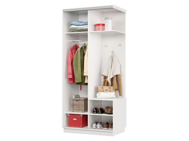 • Прихожая Маршал станет отличным решением для меблировки небольшого помещения. Конструкция поделена на две равные по размеру секции: отделение со штангой для вешалок и нишу с полками и крючками для верхней одежды. Отличительная черта модели — дверь, которая перемещается по однополосному треку вправо или влево, поочередно открывая и закрывая каждую из секций, что важно для узкого коридора.