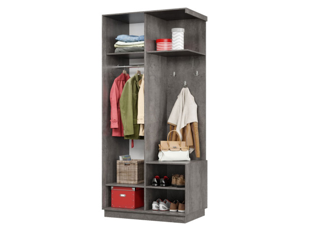 • Прихожая Маршал станет отличным решением для меблировки небольшого помещения. Конструкция поделена на две равные по размеру секции: отделение со штангой для вешалок и нишу с полками и крючками для верхней одежды. Отличительная черта модели — дверь, которая перемещается по однополосному треку вправо или влево, поочередно открывая и закрывая каждую из секций, что важно для узкого коридора.