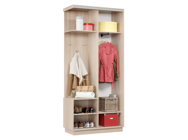 • Прихожая Маршал станет отличным решением для меблировки небольшого помещения. Конструкция поделена на две равные по размеру секции: отделение со штангой для вешалок и нишу с полками и крючками для верхней одежды. Отличительная черта модели — дверь, которая перемещается по однополосному треку вправо или влево, поочередно открывая и закрывая каждую из секций, что важно для узкого коридора.
