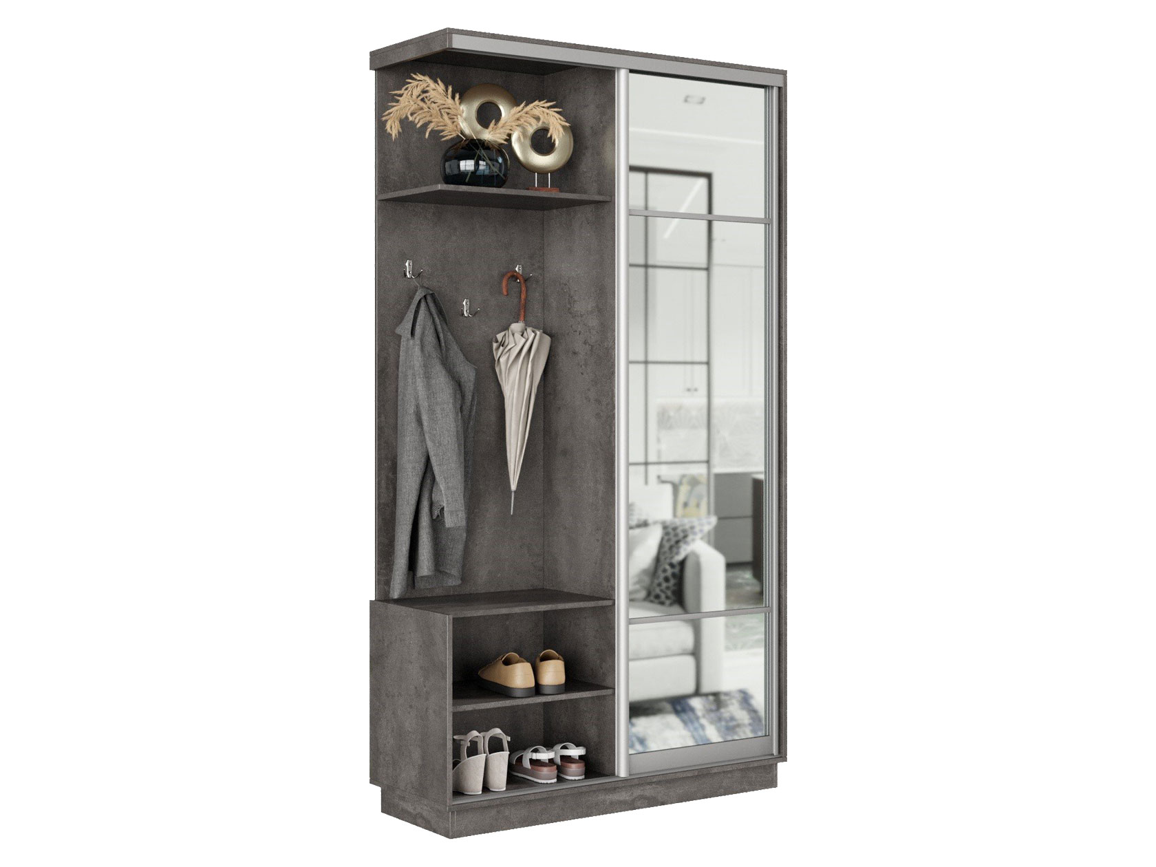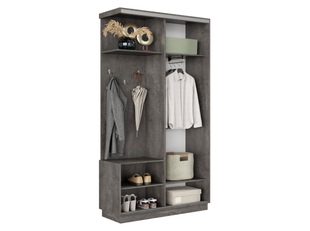 Прихожая Маршал — отличный вариант для обустройства функционального пространства в малогабаритной квартире. Система хранения поделена на две равные по размерам части: отделение со штангой и нишу с полками и крючками для повседневной одежды. Дверь перемещается по однополосному треку вправо и влево, поочередно открывая и закрывая каждую из секций, что особенно важно для узкого коридора. Зеркальный фасад позволит в деталях оценить подобранный образ и визуально расширит пространство помещения.
