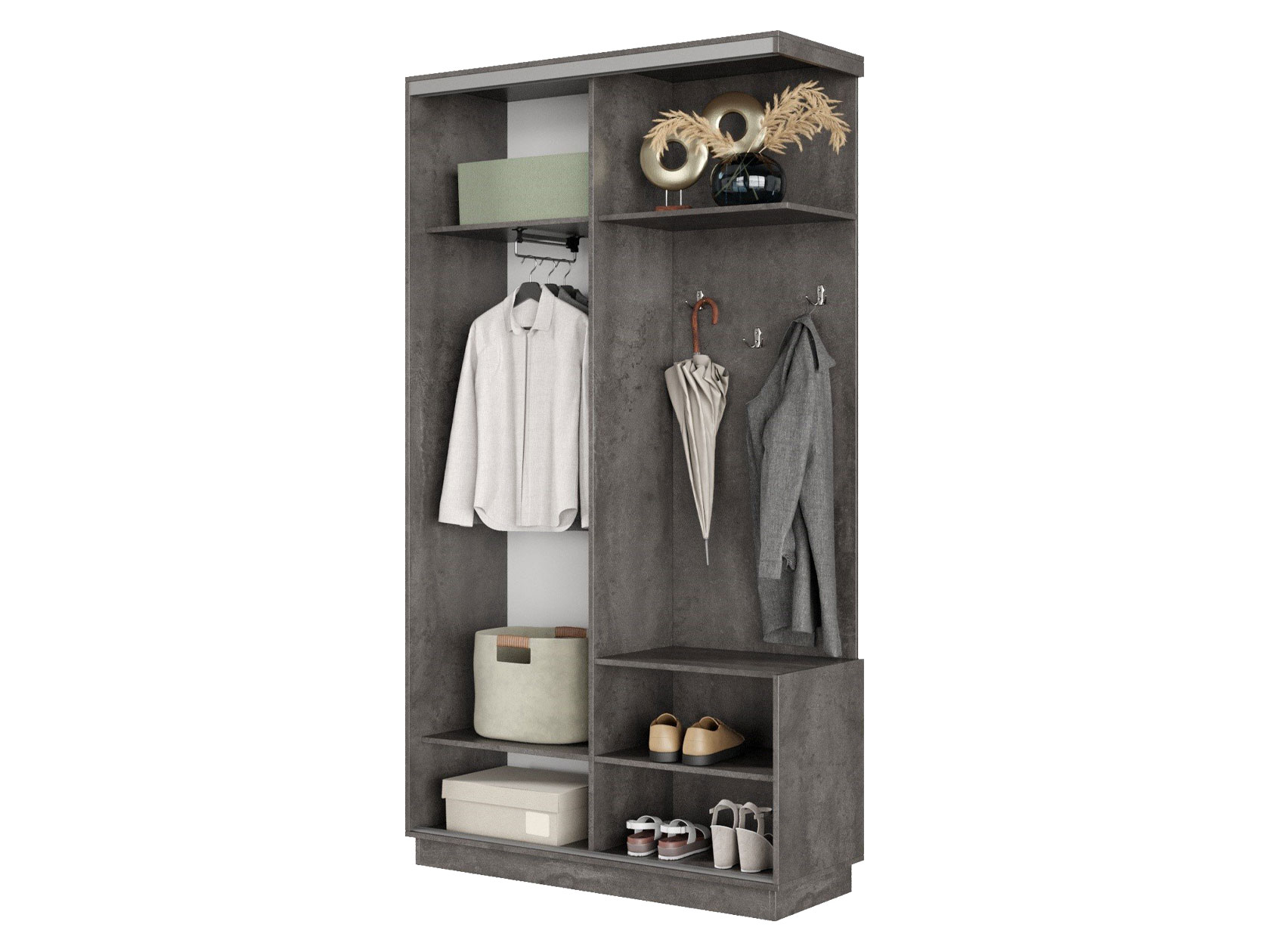 Стандартный шкаф прихожая. Недорогой шкаф. При сборке проблем не вызвал. Есть и отсек нижний под обувь. Есть и полки верхнего хранения. Для маленькой прихожей огонь