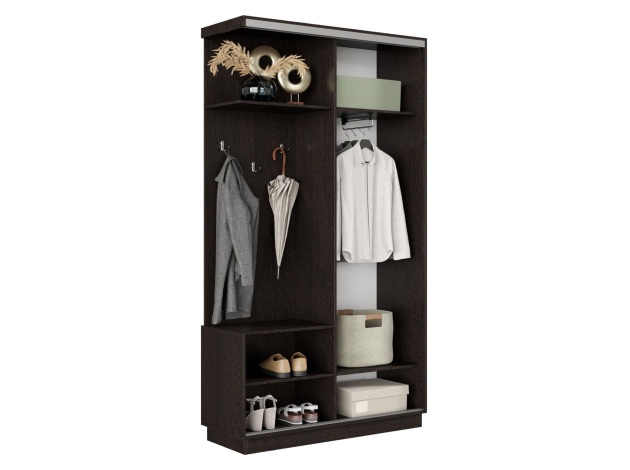 Стандартный шкаф прихожая. Недорогой шкаф. При сборке проблем не вызвал. Есть и отсек нижний под обувь. Есть и полки верхнего хранения. Для маленькой прихожей огонь