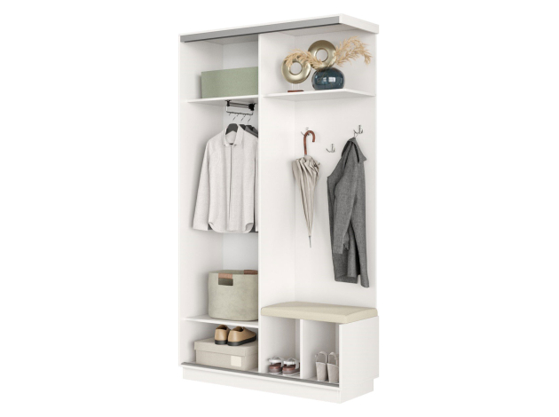 • Прихожая Маршал Лайт подойдет для обустройства функционального пространства в малогабаритной квартире. Система хранения поделена на две равные по размерам части: отделение со штангой и нишу с полками и крючками для повседневной одежды. Дверь перемещается по однополосному треку вправо и влево, поочередно открывая и закрывая каждую из секций, что особенно важно для узкого коридора. Зеркальный фасад позволит в деталях оценить подобранный образ и визуально расширит пространство помещения. Мягкое сиденье даст возможность с комфортом снимать и надевать обувь.