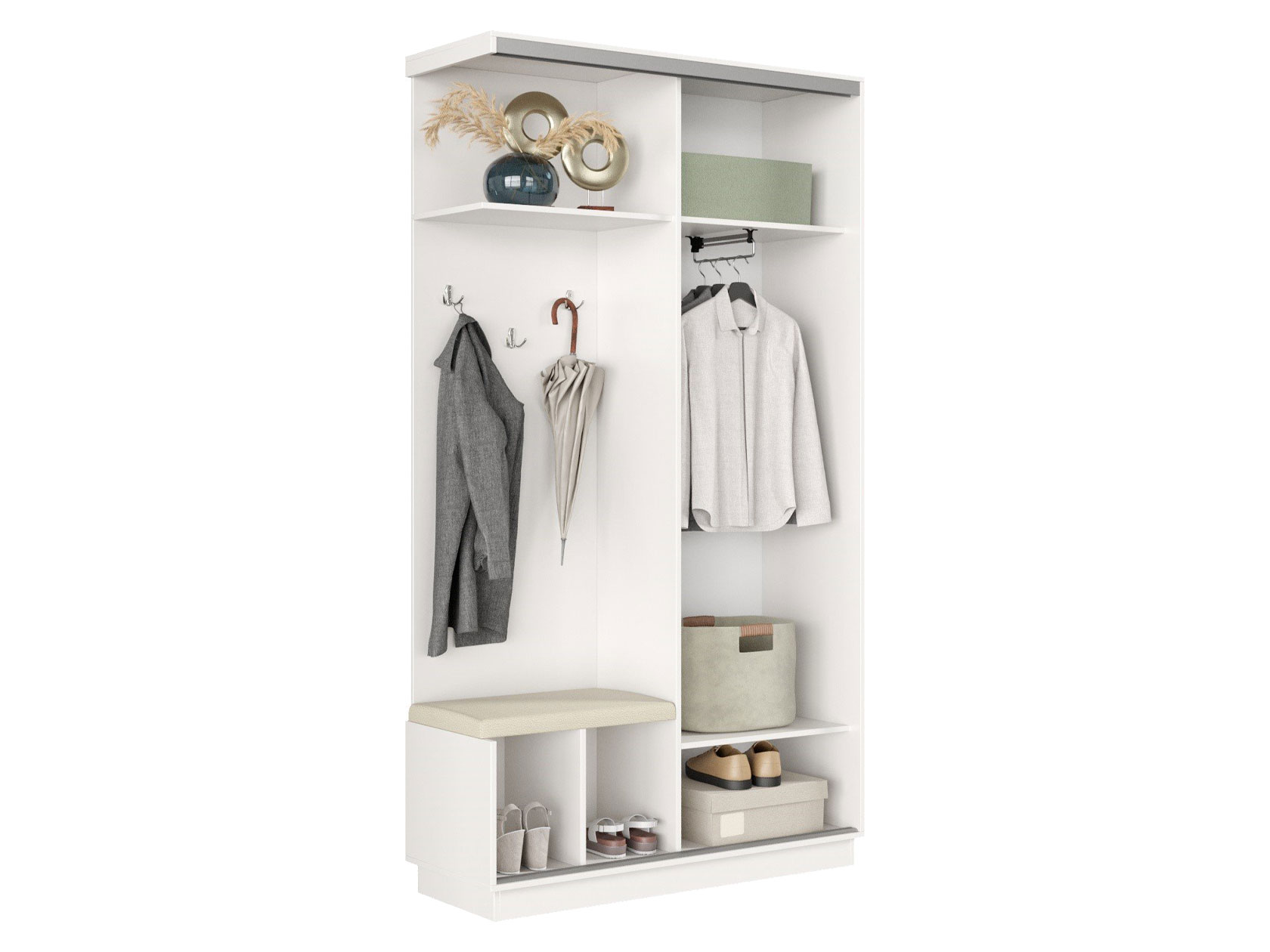• Прихожая Маршал Лайт подойдет для обустройства функционального пространства в малогабаритной квартире. Система хранения поделена на две равные по размерам части: отделение со штангой и нишу с полками и крючками для повседневной одежды. Дверь перемещается по однополосному треку вправо и влево, поочередно открывая и закрывая каждую из секций, что особенно важно для узкого коридора. Зеркальный фасад позволит в деталях оценить подобранный образ и визуально расширит пространство помещения. Мягкое сиденье даст возможность с комфортом снимать и надевать обувь.