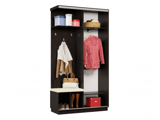 Прихожая Маршал Лайт подойдет для обустройства функционального пространства в малогабаритной квартире. Система хранения поделена на две равные по размерам части: отделение со штангой и нишу с полками и крючками для повседневной одежды. Дверь перемещается по однополосному треку вправо и влево, поочередно открывая и закрывая каждую из секций, что особенно важно для узкого коридора. Зеркальный фасад позволит в деталях оценить подобранный образ и визуально расширит пространство помещения. Мягкое сиденье даст возможность с комфортом снимать и надевать обувь.