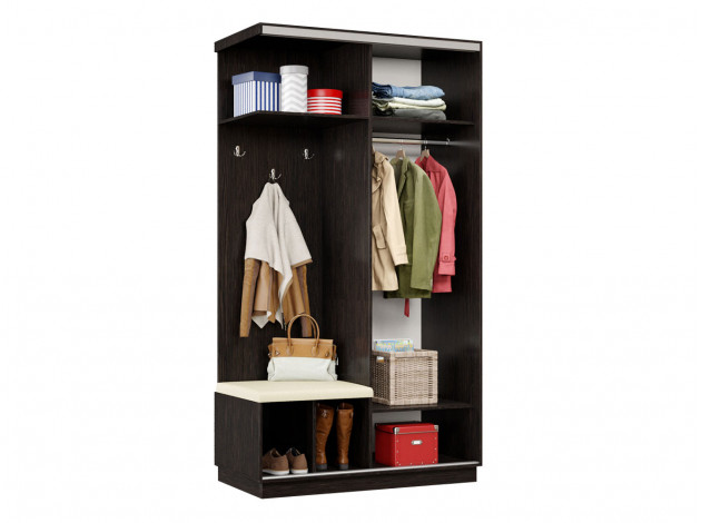 • Прихожая Маршал Лайт подойдет для обустройства функционального пространства в малогабаритной квартире. Система хранения поделена на две равные по размерам части: отделение со штангой и нишу с полками и крючками для повседневной одежды. Дверь перемещается по однополосному треку вправо и влево, поочередно открывая и закрывая каждую из секций, что особенно важно для узкого коридора. Зеркальный фасад позволит в деталях оценить подобранный образ и визуально расширит пространство помещения. Мягкое сиденье даст возможность с комфортом снимать и надевать обувь.