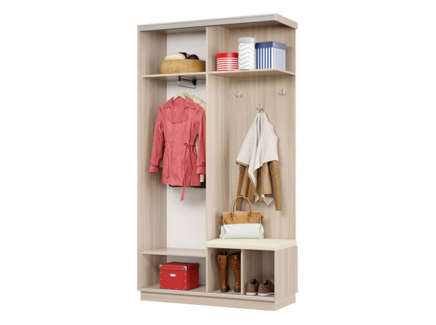 • Прихожая Маршал Лайт подойдет для обустройства функционального пространства в малогабаритной квартире. Система хранения поделена на две равные по размерам части: отделение со штангой и нишу с полками и крючками для повседневной одежды. Дверь перемещается по однополосному треку вправо и влево, поочередно открывая и закрывая каждую из секций, что особенно важно для узкого коридора. Зеркальный фасад позволит в деталях оценить подобранный образ и визуально расширит пространство помещения. Мягкое сиденье даст возможность с комфортом снимать и надевать обувь.