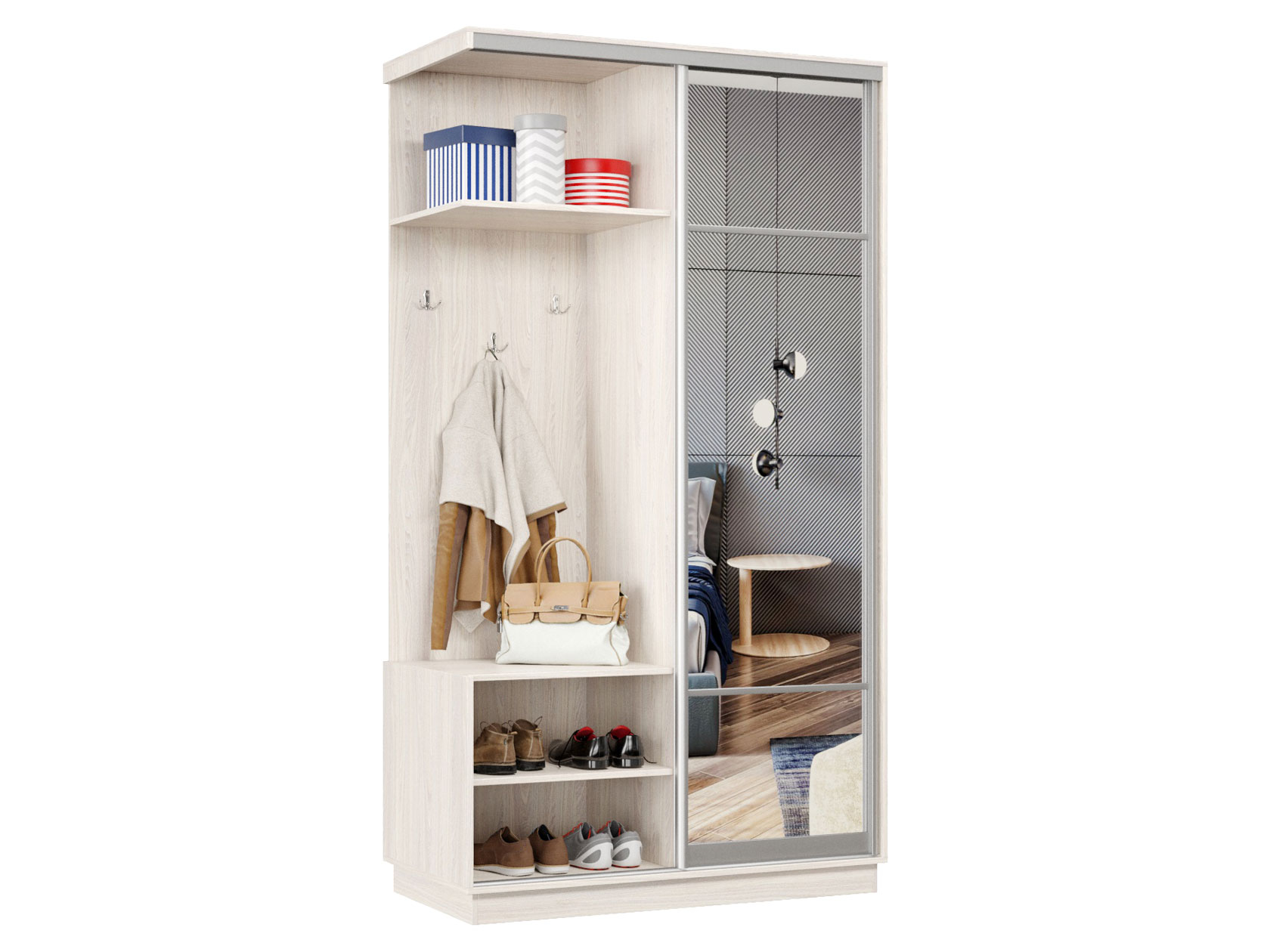 • Прихожая Маршал позволит обустроить функциональное пространство в малогабаритной квартире. Система хранения поделена на две равные по размерам части: отделение со штангой и нишу с полками и крючками для повседневной одежды. Дверь перемещается по однополосному треку вправо и влево, поочередно открывая и закрывая каждую из секций, что особенно важно для узкого коридора. Зеркальный фасад позволит в деталях оценить подобранный образ и визуально расширит пространство помещения.