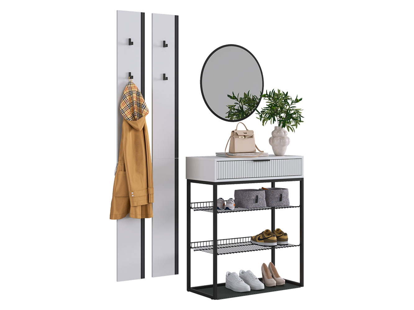 Прихожая Мерси Арт украсит входную зону, обеспечив место для хранения верхней одежды и обуви. Открытые ниши и лаконичные крючки идеально интегрируются в любой стиль интерьера. Выдвижной ящик позволяет быстро находить необходимое перед выходом из дома: средства для ухода за обувью, ключи, очки и косметику.