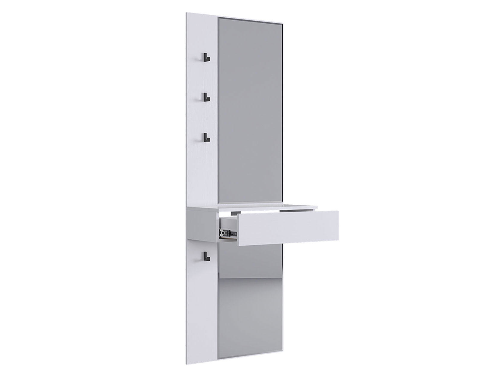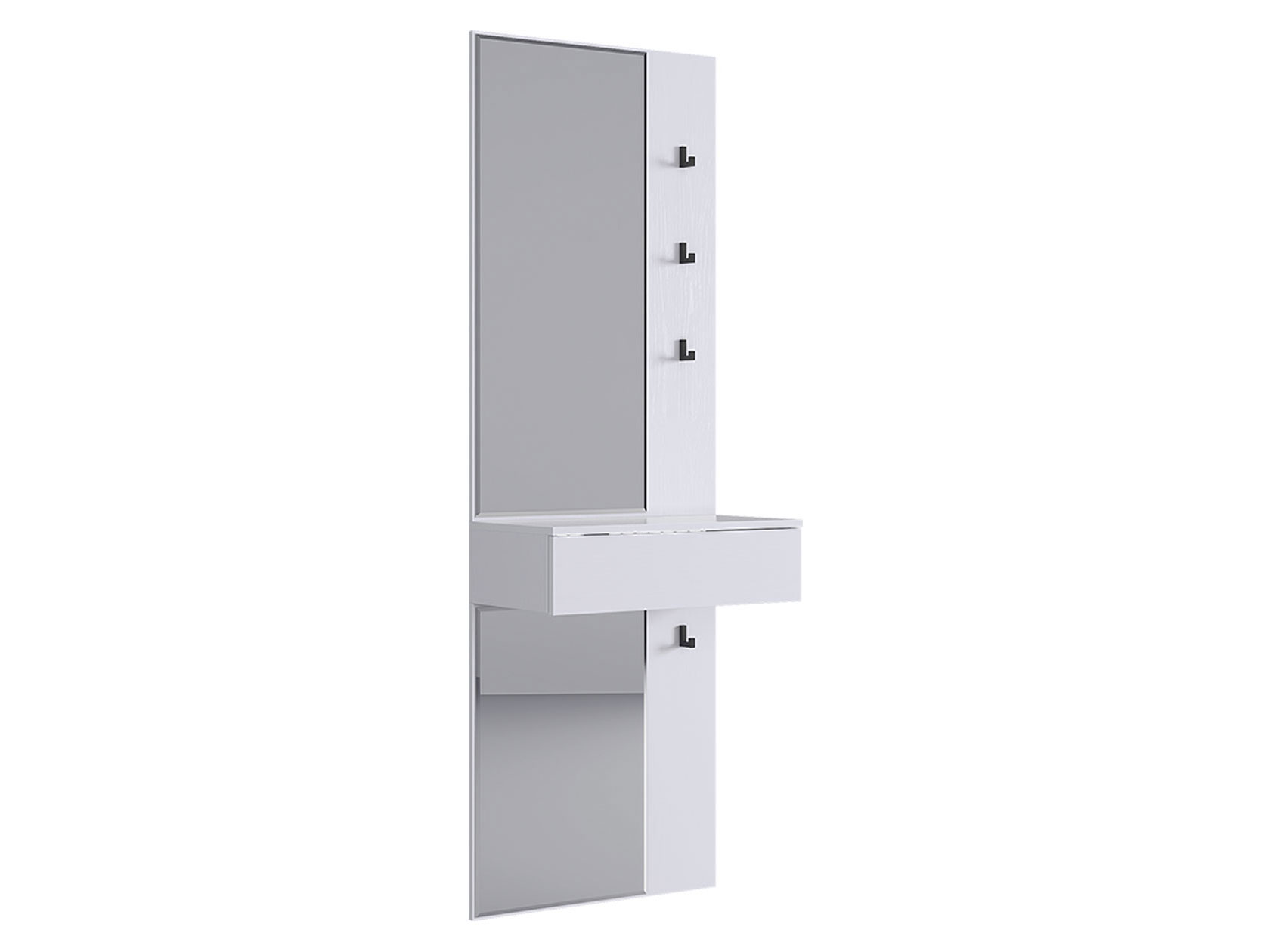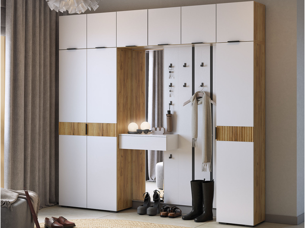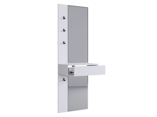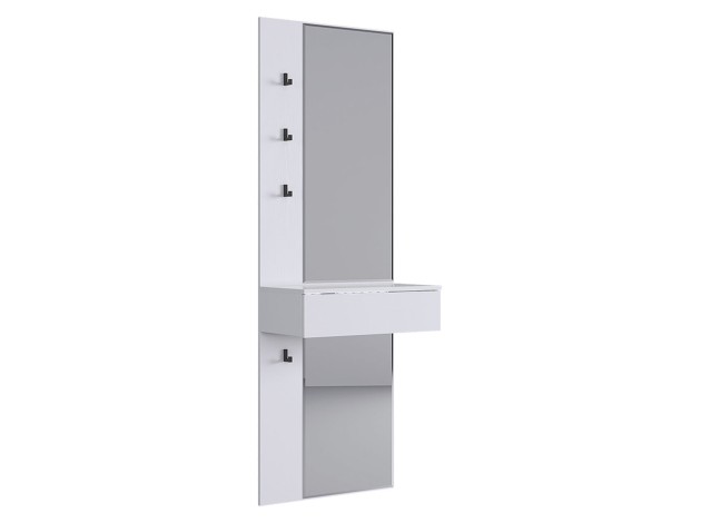 Прихожая Мерси позволит аккуратно распределить вещи и наполнит комнату светом. Габариты зеркала дают возможность видеть себя в полный рост, что очень удобно перед выходом из дома. Прочные разноуровневые крючки обеспечат место для сумок и аксессуаров. Выдвижной ящик подходит для хранения необходимых мелочей: ключей, косметики, солнечных очков и расчески.
