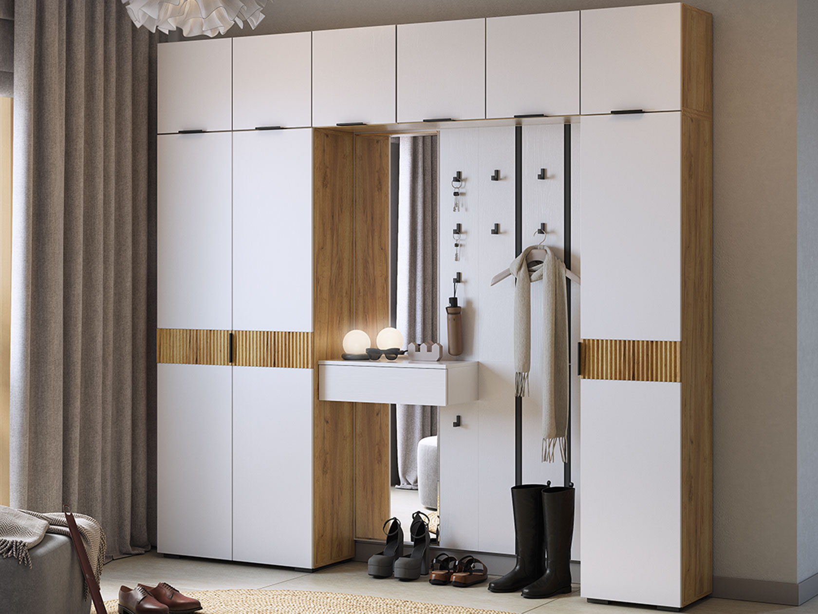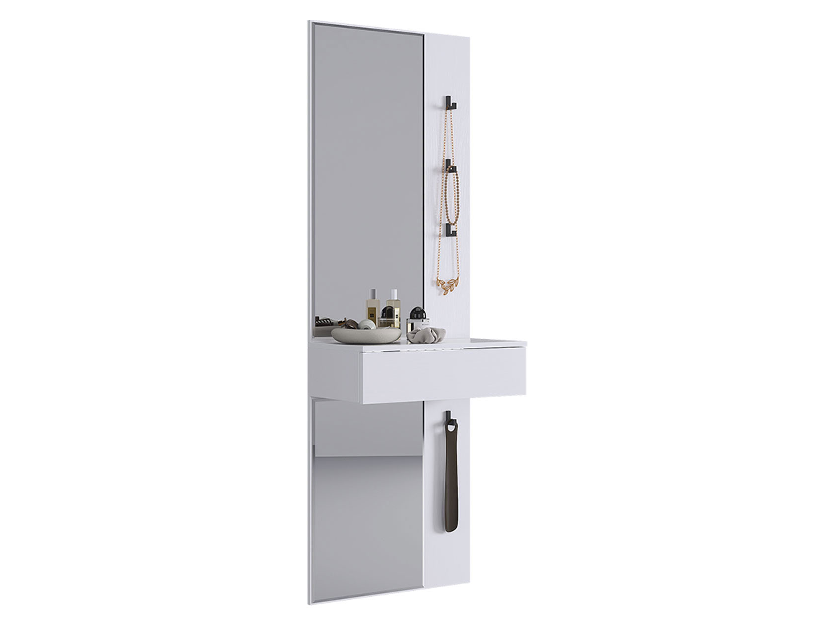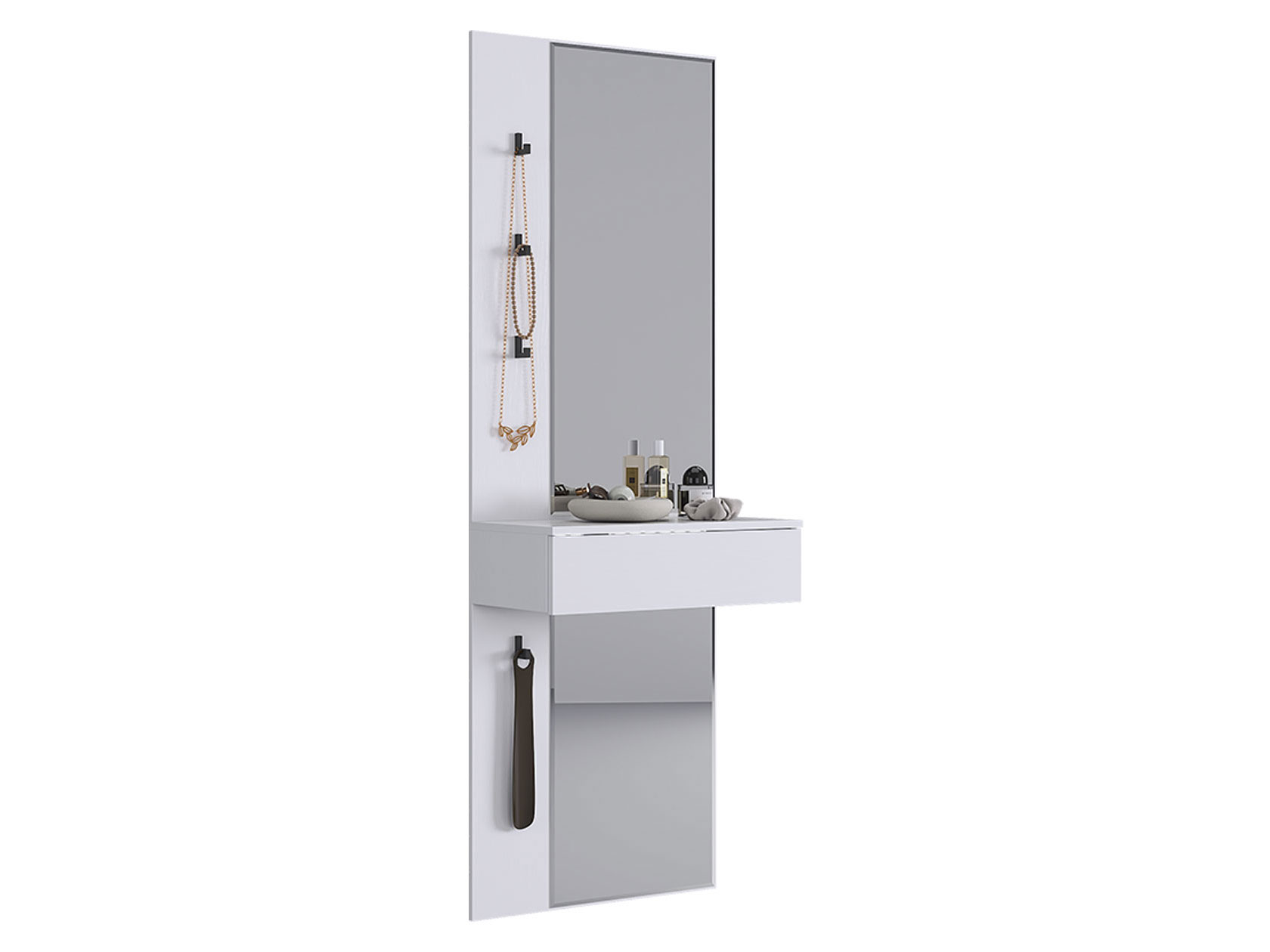 Прихожая Мерси позволит аккуратно распределить вещи и наполнит комнату светом. Габариты зеркала дают возможность видеть себя в полный рост, что очень удобно перед выходом из дома. Прочные разноуровневые крючки обеспечат место для сумок и аксессуаров. Выдвижной ящик подходит для хранения необходимых мелочей: ключей, косметики, солнечных очков и расчески.