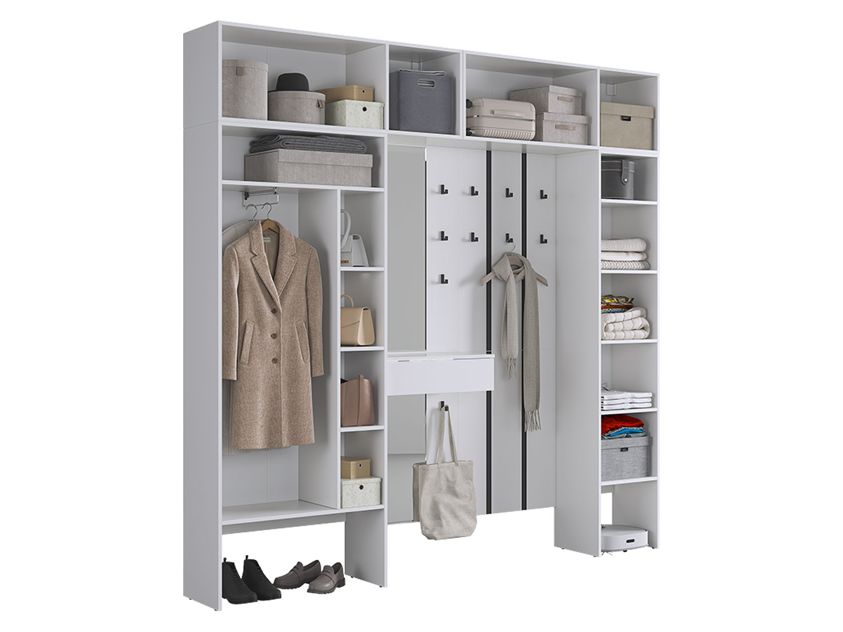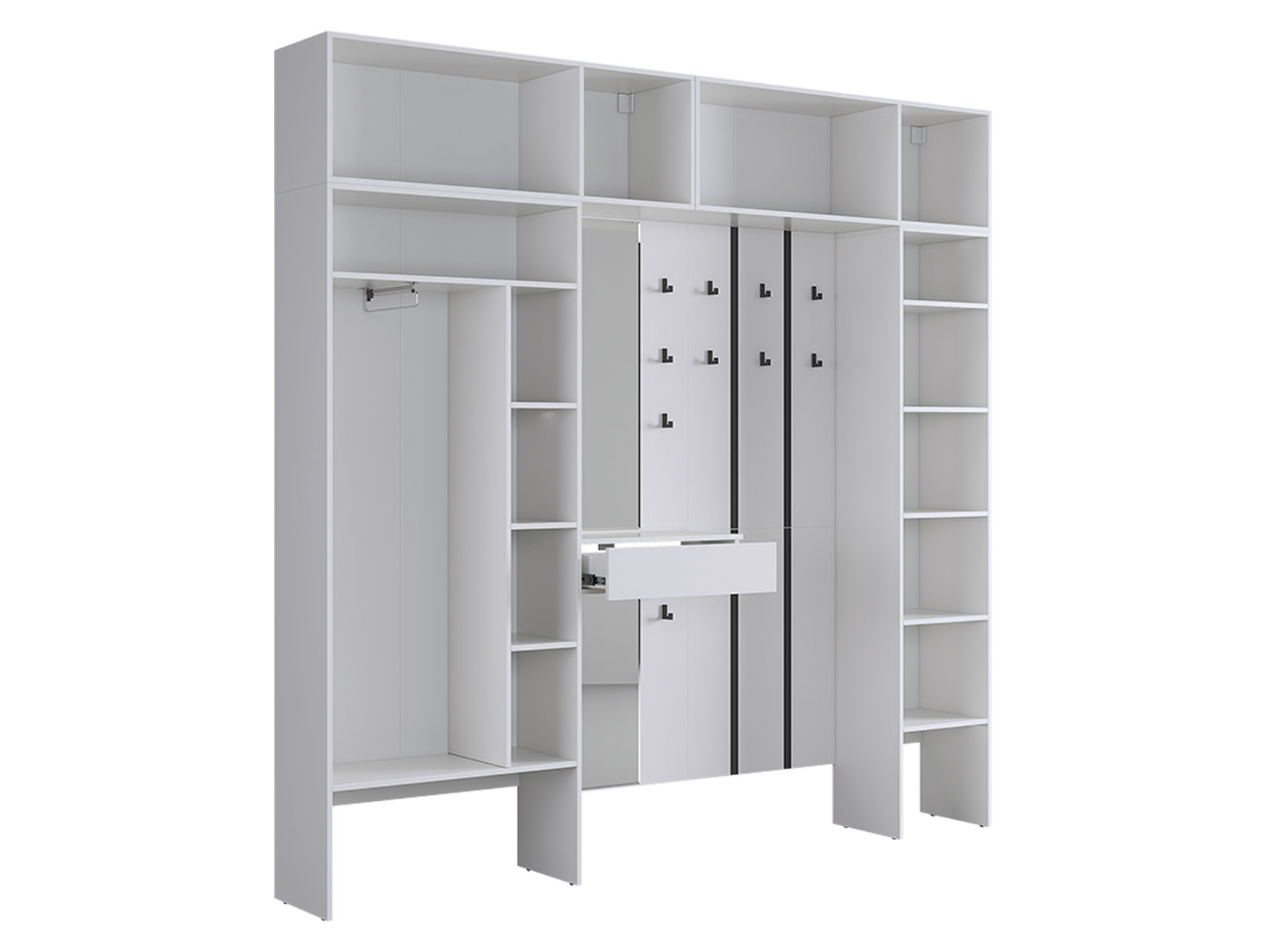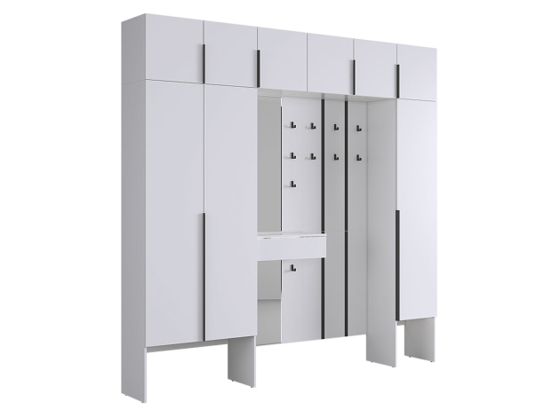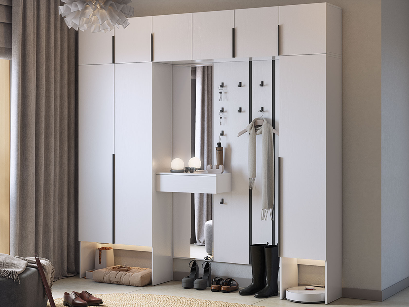 Прихожая Мерси Классика обеспечит место для всех вещей и обуви. Шкафы и антресоли подходят для хранения курток, плащей и головных уборов. Открытые вешалки с крючками помогают держать под рукой сезонные предметы гардероба. Полноростовое зеркало станет завершающим штрихом меблировки. Матовые фасады дополнены узкими черными ручками, что актуально выглядит в современном интерьере.