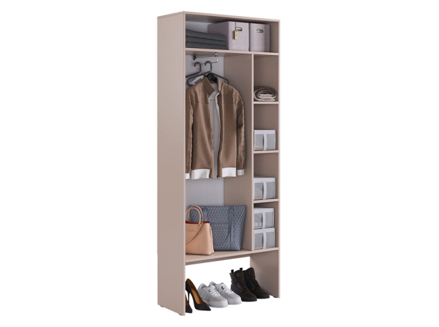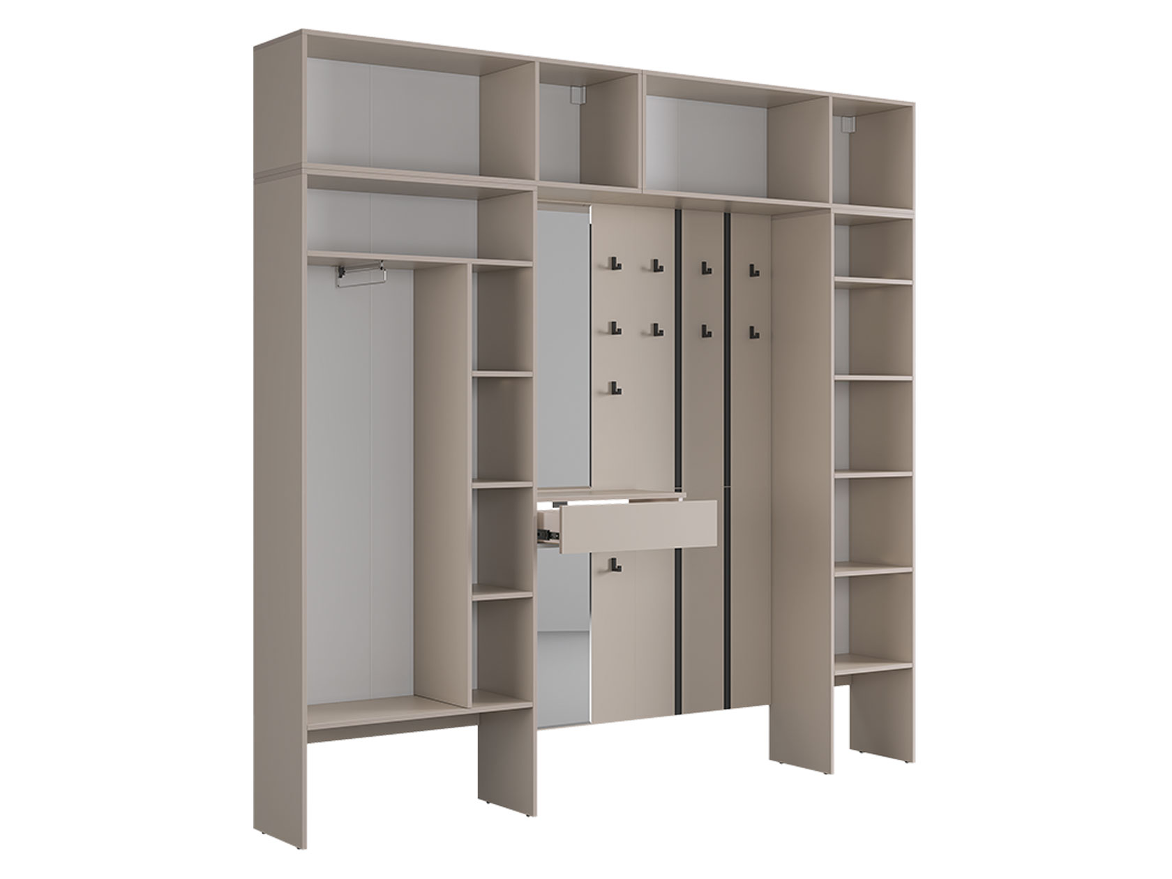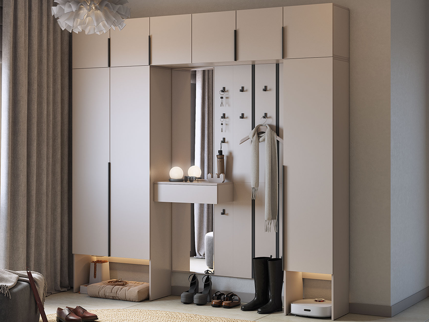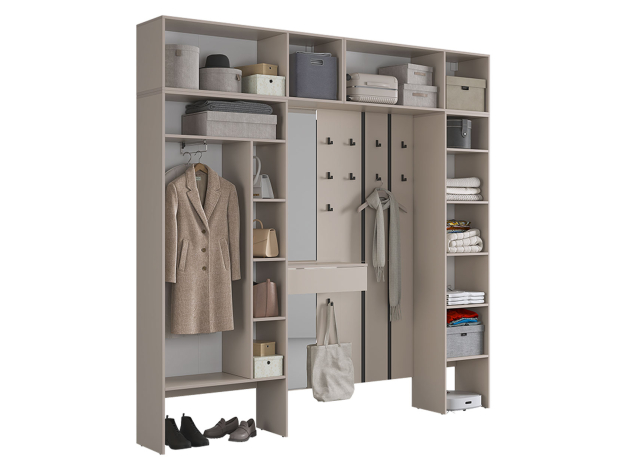 Прихожая Мерси Классика обеспечит место для всех вещей и обуви. Шкафы и антресоли подходят для хранения курток, плащей и головных уборов. Открытые вешалки с крючками помогают держать под рукой сезонные предметы гардероба. Полноростовое зеркало станет завершающим штрихом меблировки. Матовые фасады дополнены узкими черными ручками, что актуально выглядит в современном интерьере.