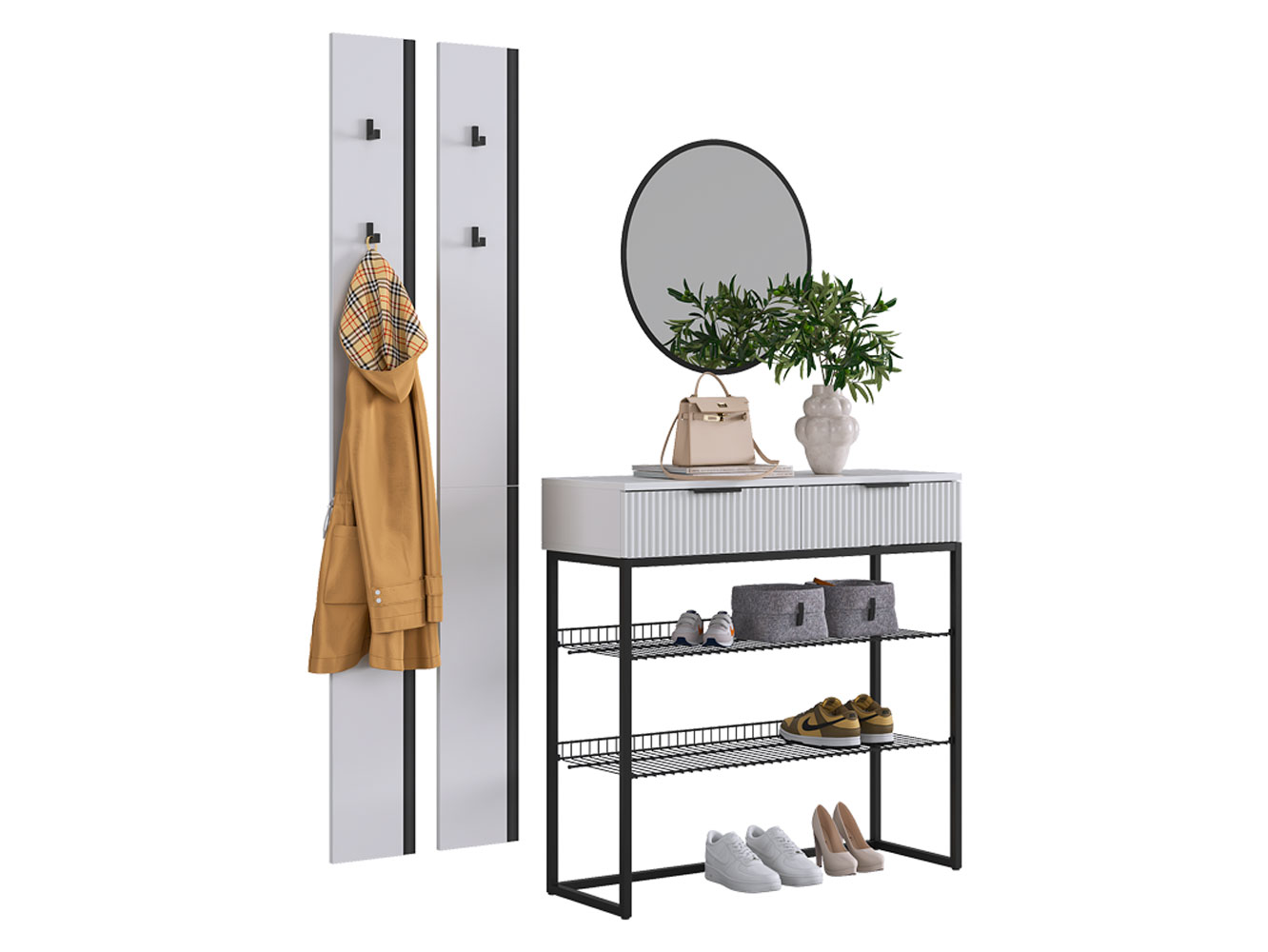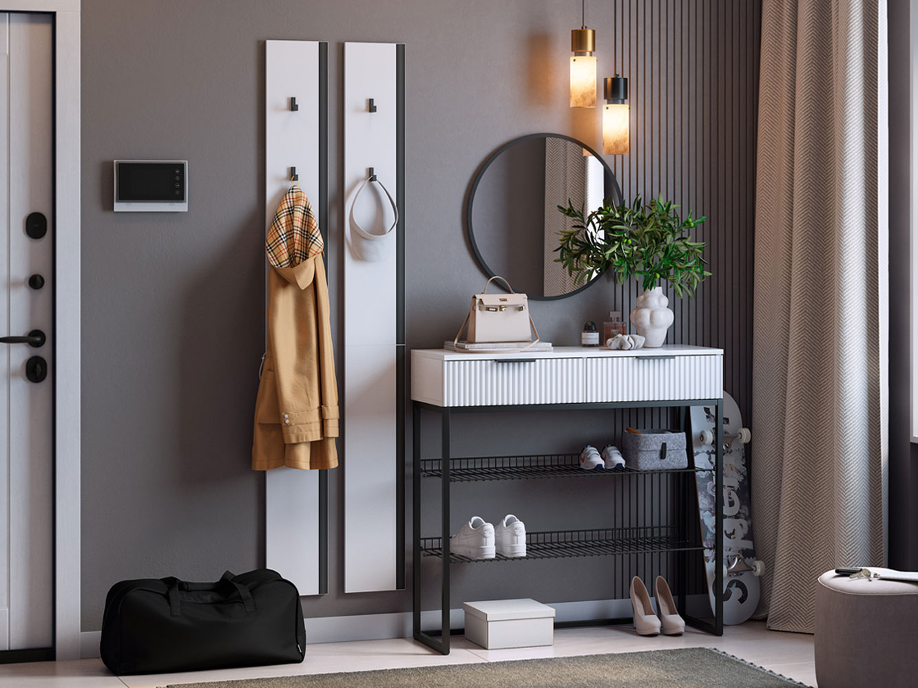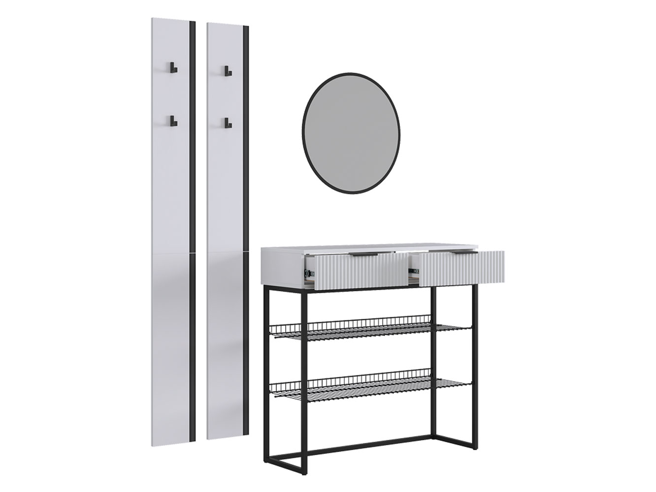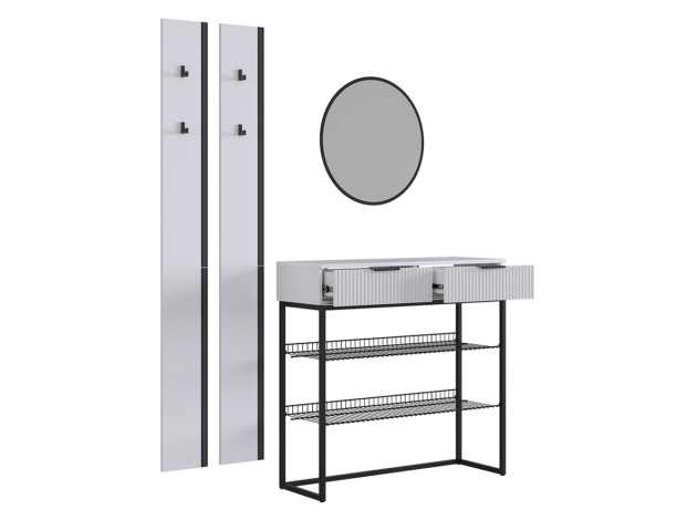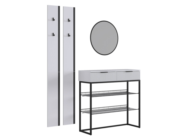 Прихожая Мерси Лайт поможет поддерживать порядок при входе в квартиру. На вешалках с крючками удобно расположить повседневную одежду любой длины, а также сумки и аксессуары. Открытые ниши позволяют хранить до нескольких пар обуви. Металлические полки устойчивы к влаге и без труда очищаются от загрязнений. Выдвижная секция обеспечит место для полезных мелочей.
