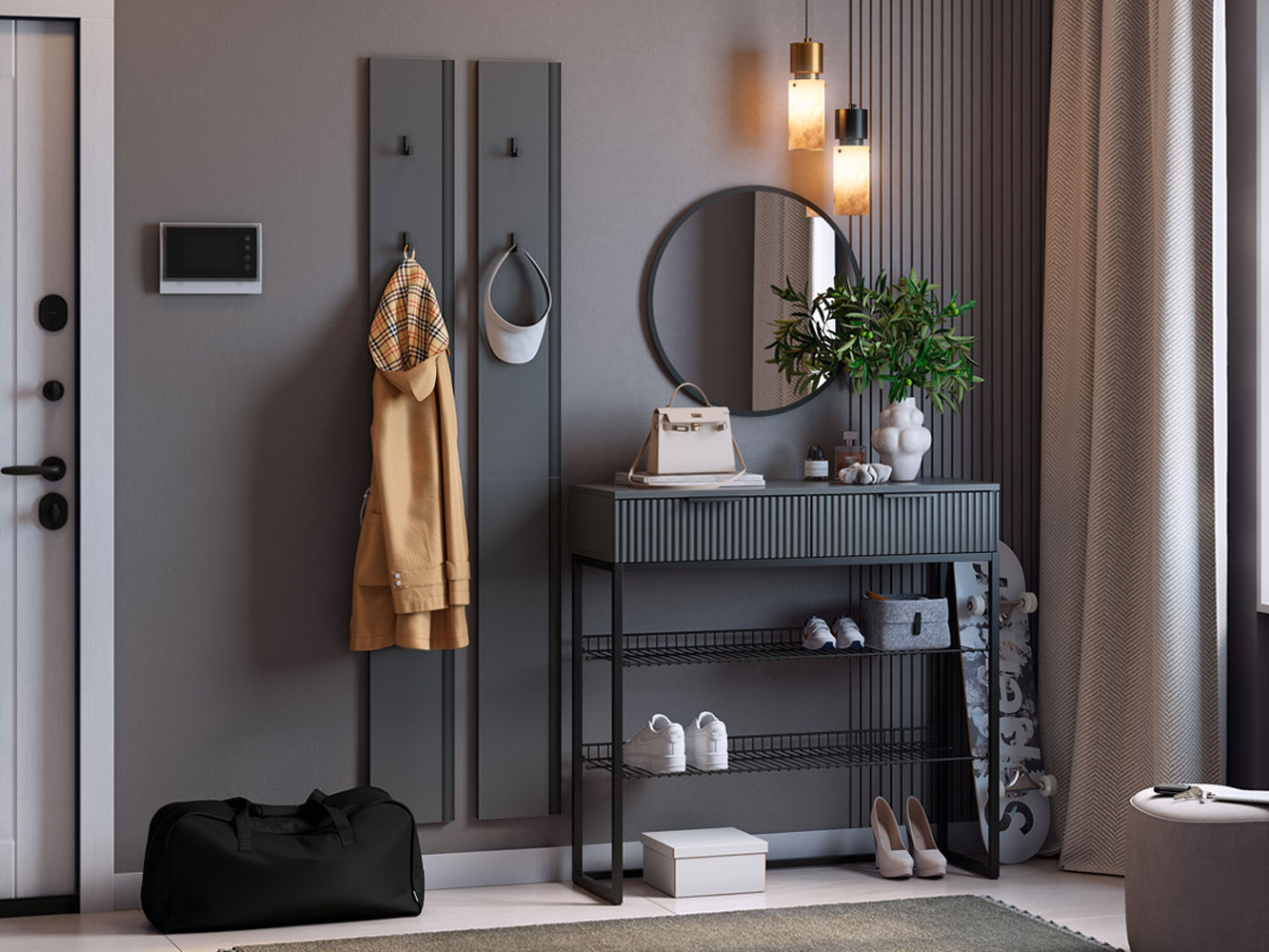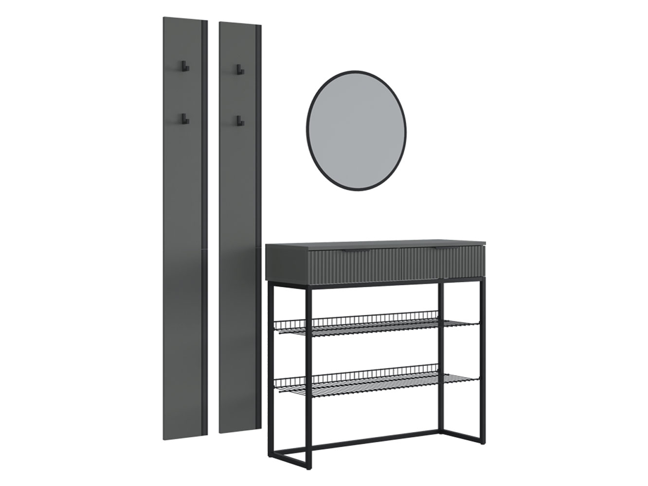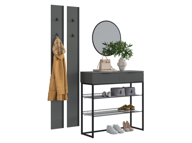 Прихожая Мерси Лайт поможет поддерживать порядок при входе в квартиру. На вешалках с крючками удобно расположить повседневную одежду любой длины, а также сумки и аксессуары. Открытые ниши позволяют хранить до нескольких пар обуви. Металлические полки устойчивы к влаге и без труда очищаются от загрязнений. Выдвижная секция обеспечит место для полезных мелочей.