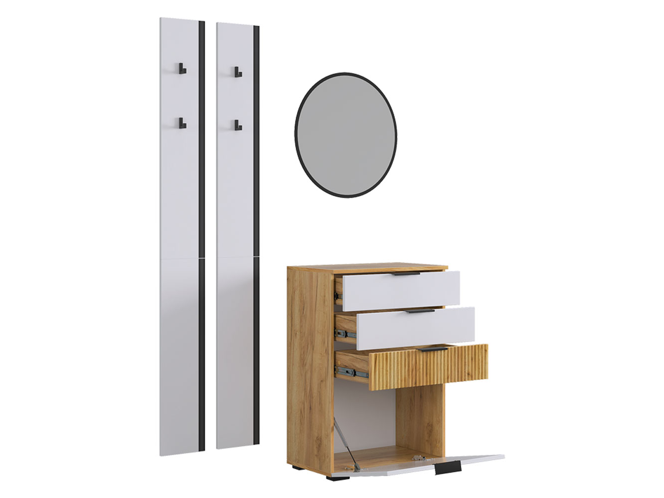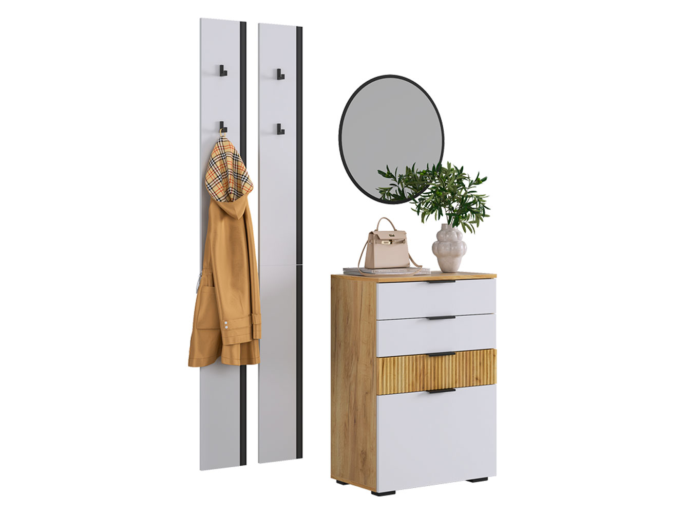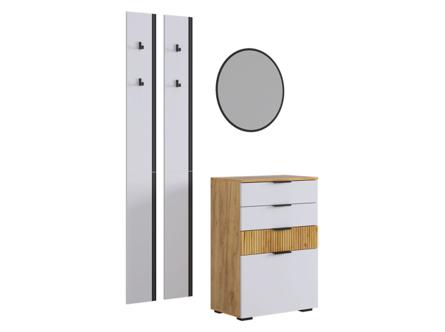 Прихожая Мерси Смарт станет оптимальным решением для обустройства входной зоны в небольшой квартире. Открытые вешалки с прочными крючками отлично смотрятся в любом интерьере. Практичный комод благодаря комбинированному наполнению поможет разместить множество нужных вещей. Фрезеровка и текстура дерева в отделке создают уютную обстановку.