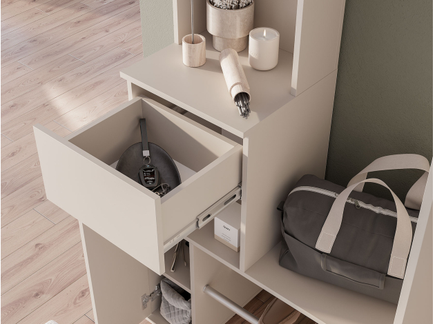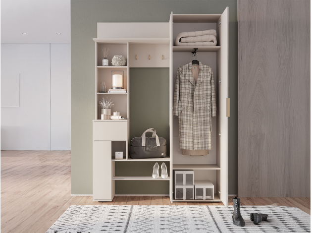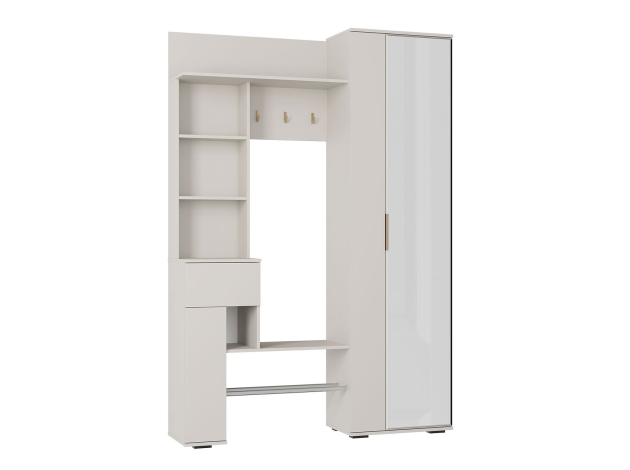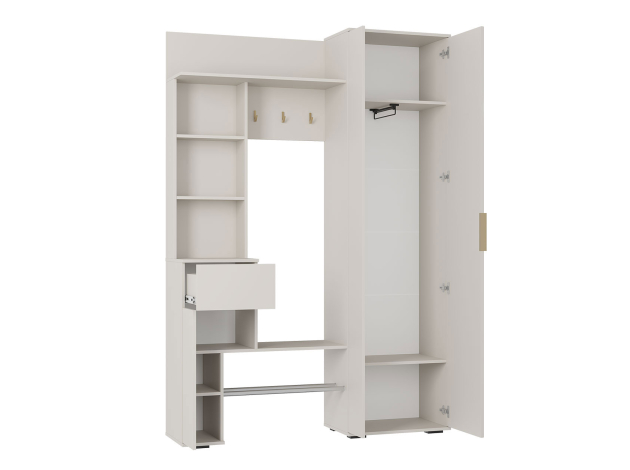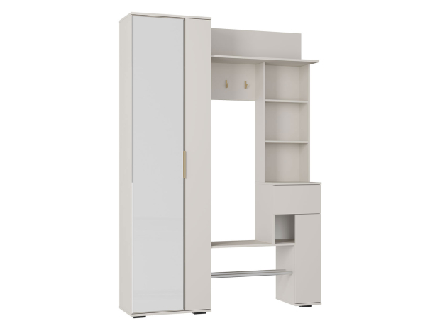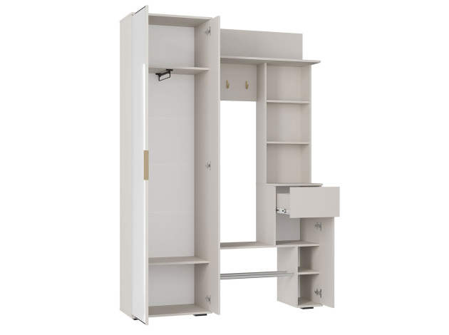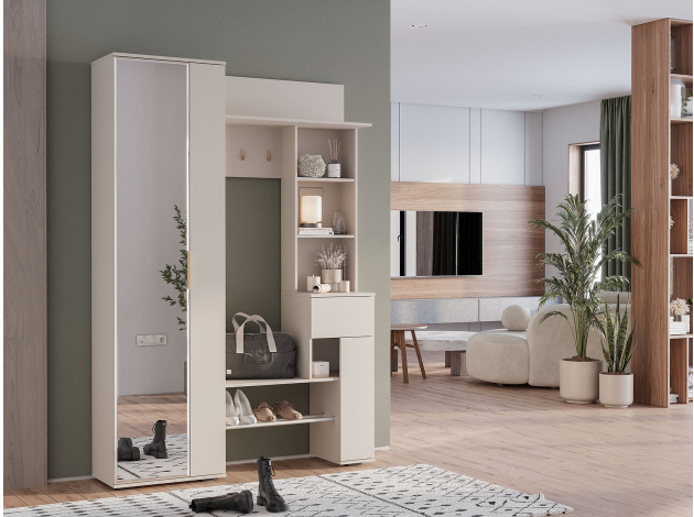 Прихожая Ницца — неглубокая модель для хранения верхней и повседневной одежды, обуви, сумок и аксессуаров. Комбинированное наполнение позволяет рационально распределить предметы гардероба и легко найти нужную вещь. Зеркальное полотно добавляет помещению света и визуальной легкости. В выдвижном ящике удобно держать ключи, очки и другие полезные мелочи, которые могут понадобиться перед выходом из дома.