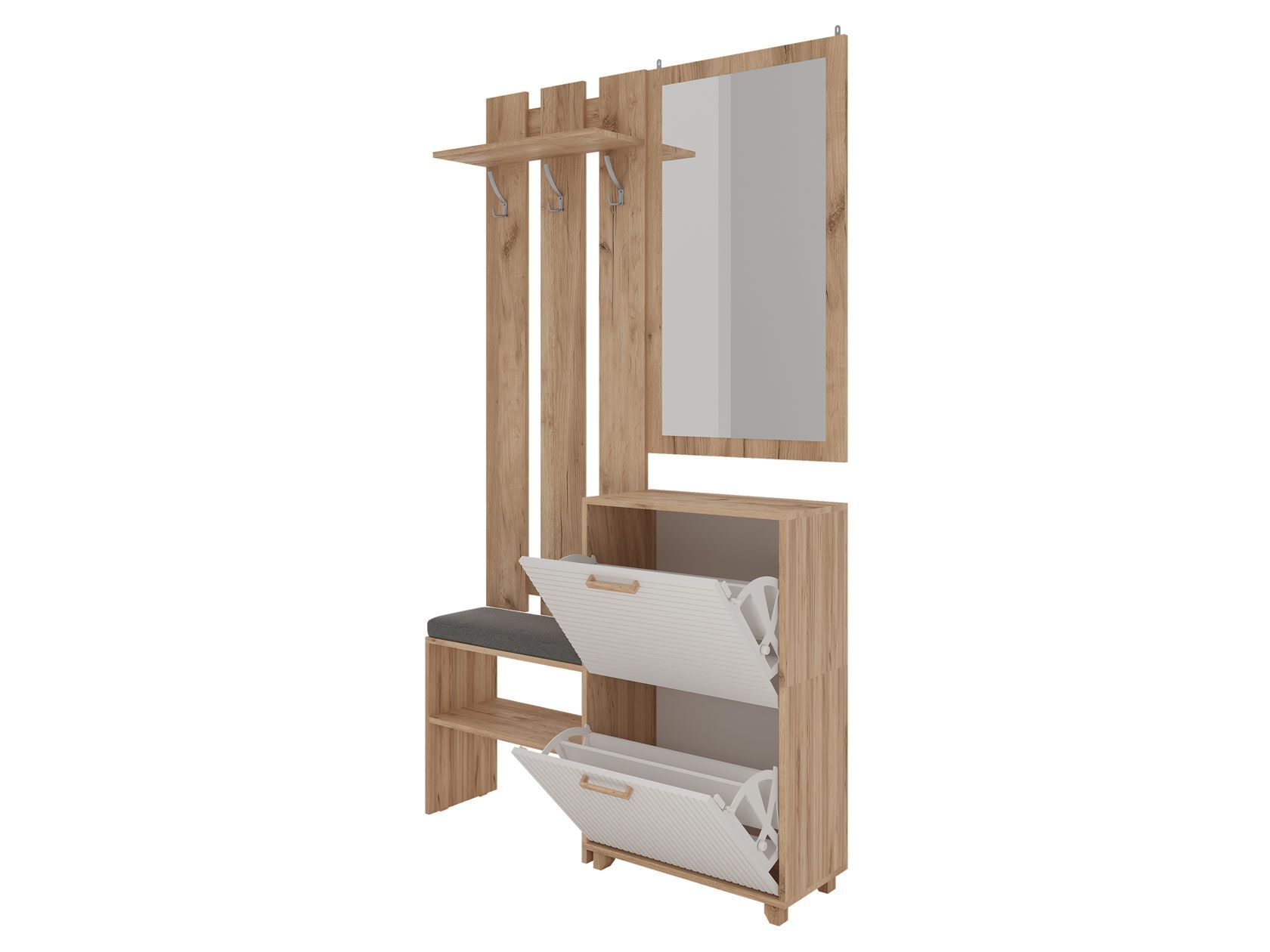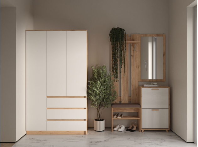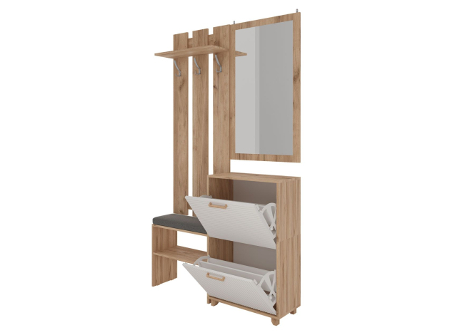 Прихожая Ньерд сочетает все необходимые элементы для удобства входной зоны. На вешалке можно разместить верхнюю одежду, сумки и зонты. Обувница с откидным механизмом обеспечивает быстрый доступ к содержимому. Зеркало позволяет оценить внешний вид перед выходом из дома. Лаконичная банкетка выступит в роли сиденья для переобувания.