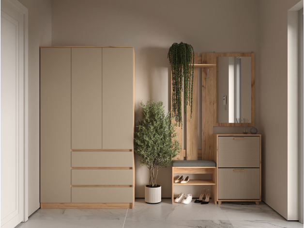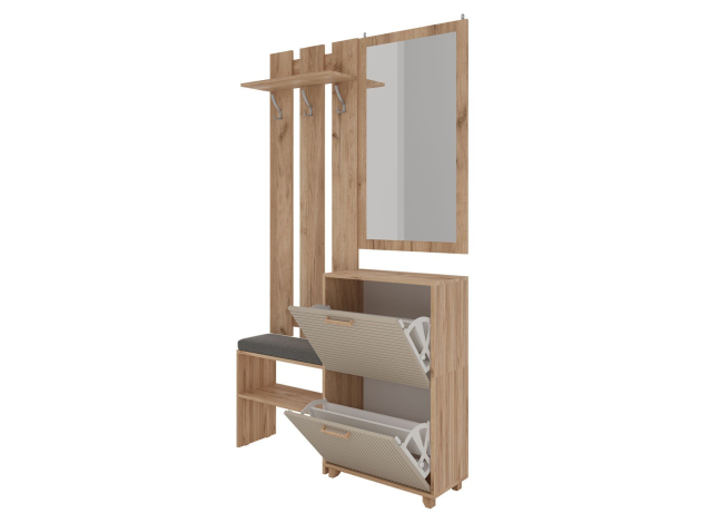 Прихожая Ньерд сочетает все необходимые элементы для удобства входной зоны. На вешалке можно разместить верхнюю одежду, сумки и зонты. Обувница с откидным механизмом обеспечивает быстрый доступ к содержимому. Зеркало позволяет оценить внешний вид перед выходом из дома. Лаконичная банкетка выступит в роли сиденья для переобувания.