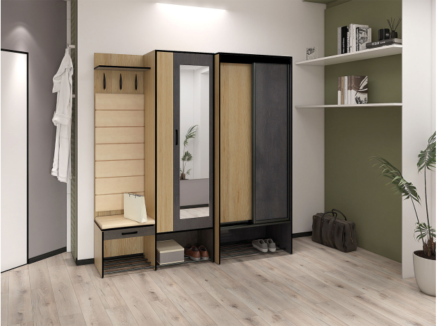 Прихожая Ольга Практик поможет организовать удобную систему хранения одежды, головных уборов, сумок и аксессуаров. Шкаф-купе экономит место и защищает вещи от пыли. На вешалке с крючками удобно хранить предметы, которые часто нужны под рукой. Зеркало на фасаде позволит рассмотреть свое отражение в полный рост.