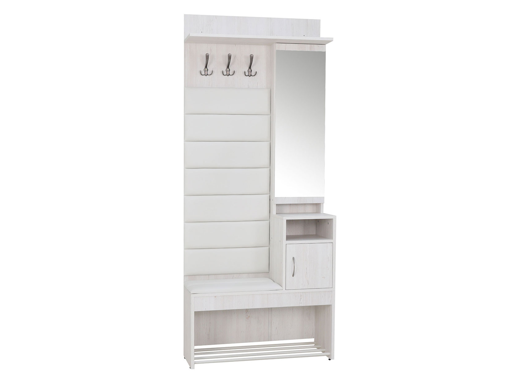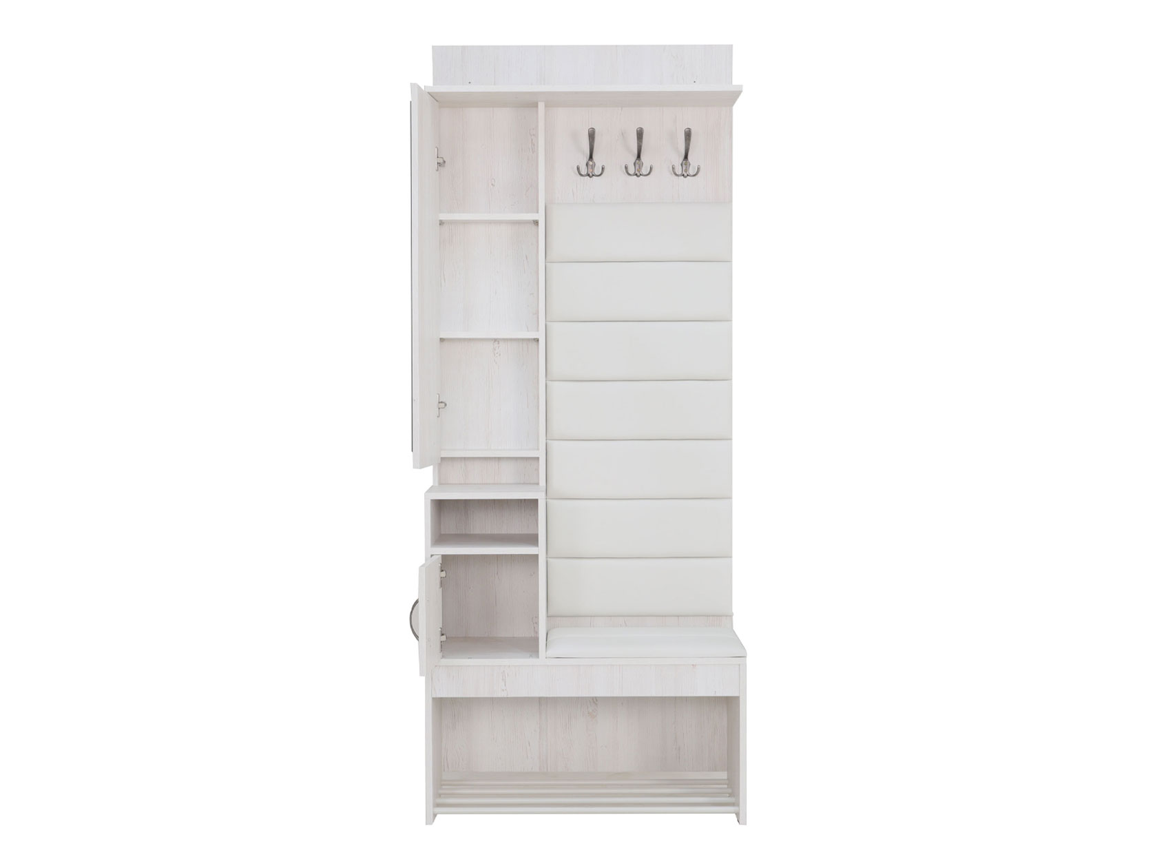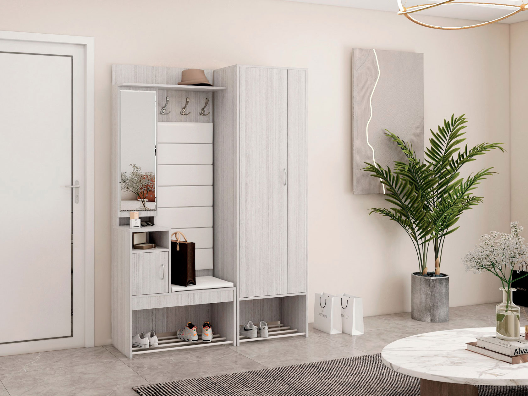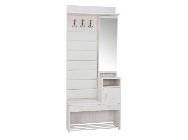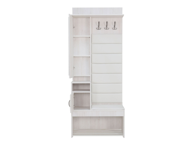 Прихожая Ольга Софт объединяет функциональные элементы с удобным и продуманным наполнением. За распашными дверцами, выдвижном ящике и на полках найдется место для всех необходимых вещей: от верхней одежды до запасных ключей. Банкетка с мягкими сиденьем и спинкой добавит удобства и создаст уютные акценты при входе в квартиру.