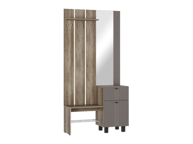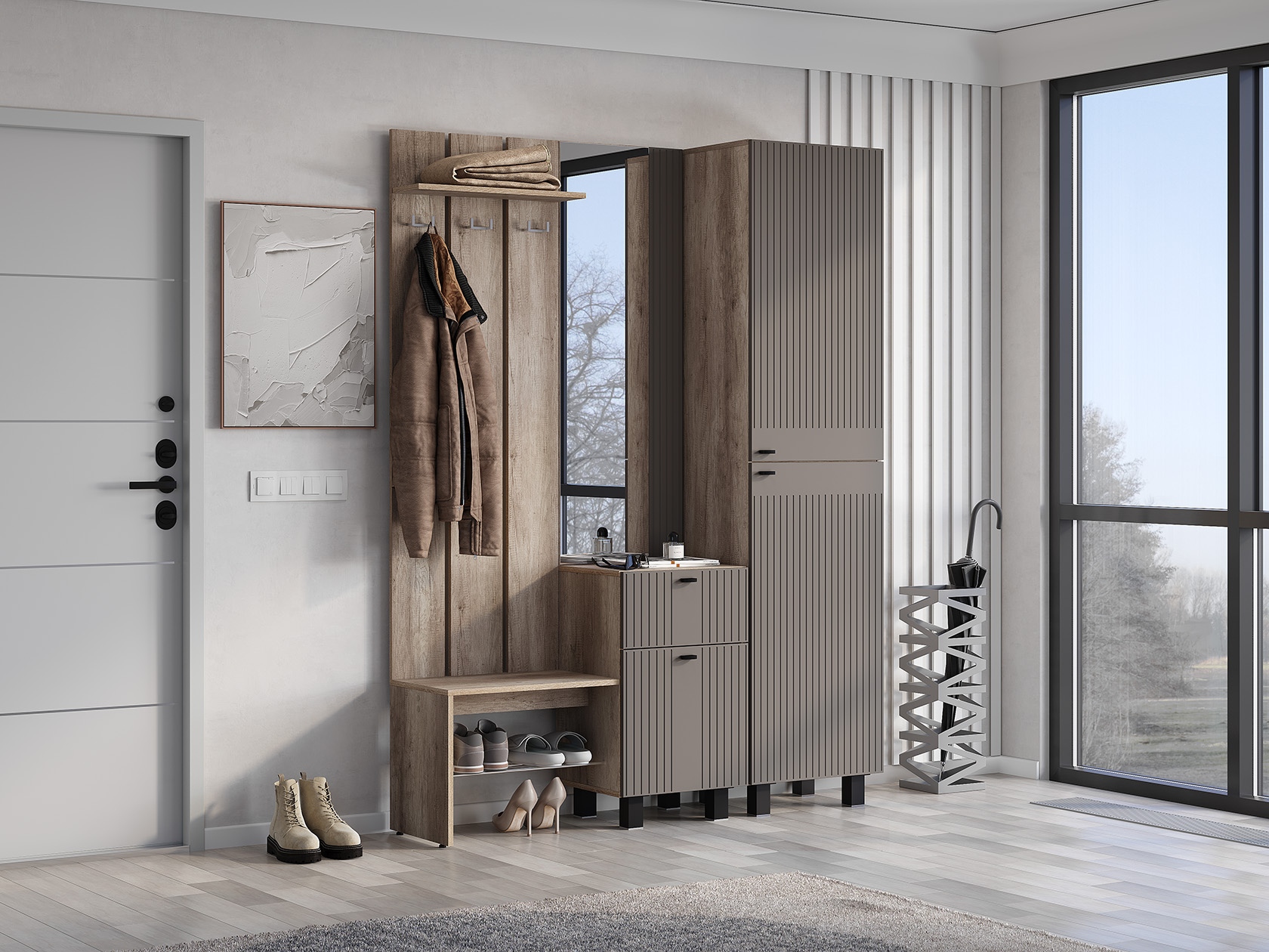 Прихожая Олива со шкафом поможет удобно разместить повседневную верхнюю одежду, обувь и аксессуары при входе в квартиру. Однотонные фасады с вертикальной фрезеровкой гармонично сочетаются с древесной текстурой. Такой дизайн смотрится очень уютно и актуально. Благодаря качественной фурнитуре пользоваться мебелью комфортно и приятно.