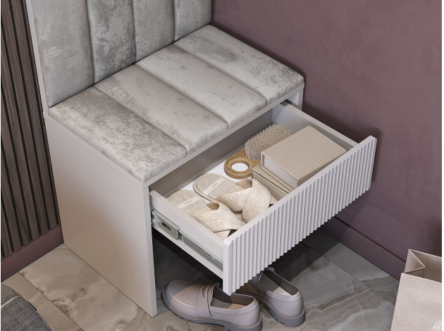 Прихожая Пандора легко интегрируется в небольшое пространство и позволяет поддерживать порядок во входной зоне. Вешалка с прочными крючками и тумба с ящиком помогут держать под рукой необходимые предметы гардероба. Мягкие накладки создают уютный акцент в интерьере, а скамейка добавляет удобства во время переобувания.