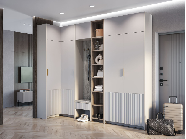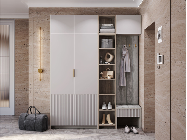 Прихожая Пандора легко интегрируется в небольшое пространство и позволяет поддерживать порядок во входной зоне. Вешалка с прочными крючками и тумба с ящиком помогут держать под рукой необходимые предметы гардероба. Мягкие накладки создают уютный акцент в интерьере, а скамейка добавляет удобства во время переобувания.