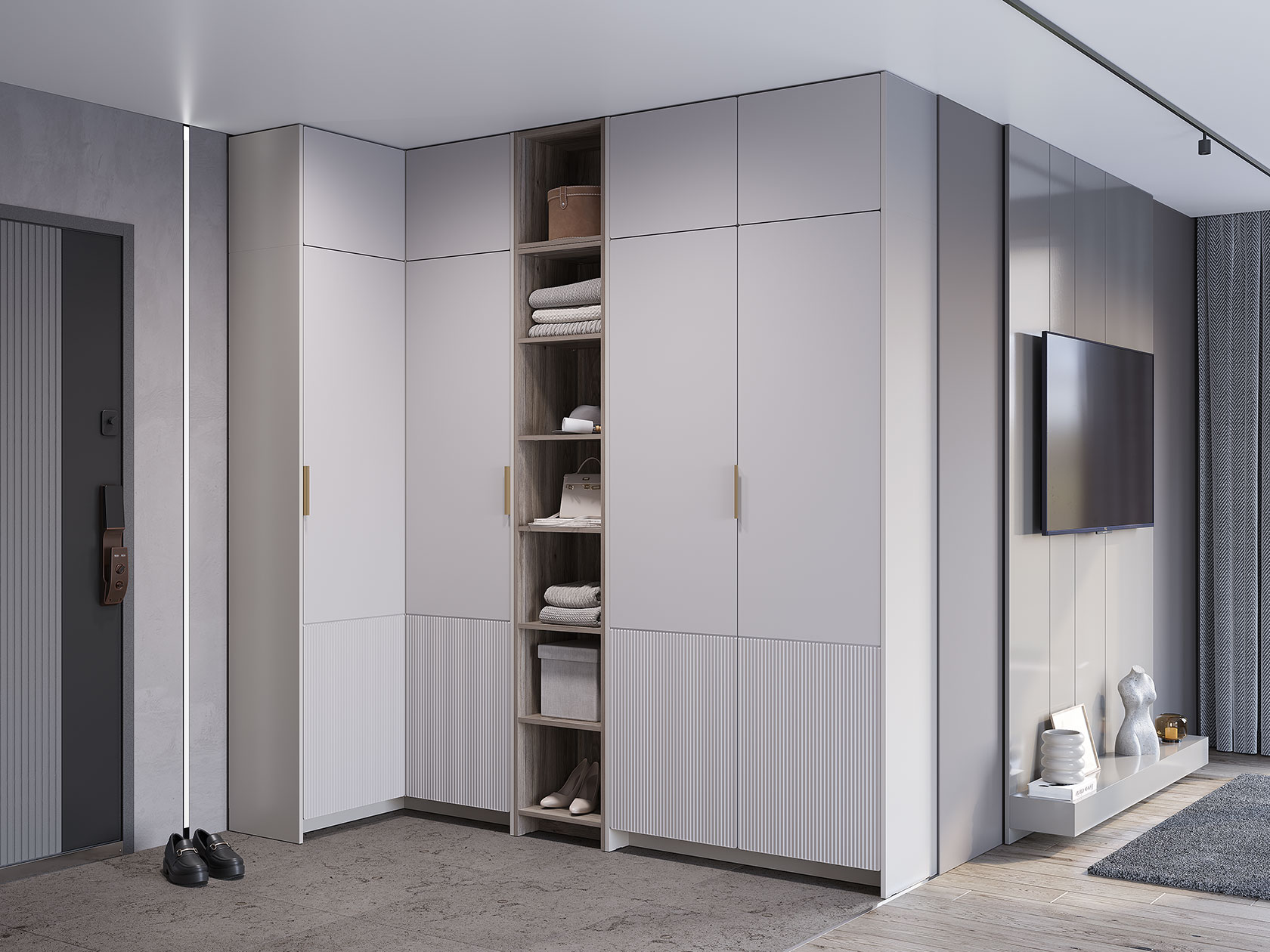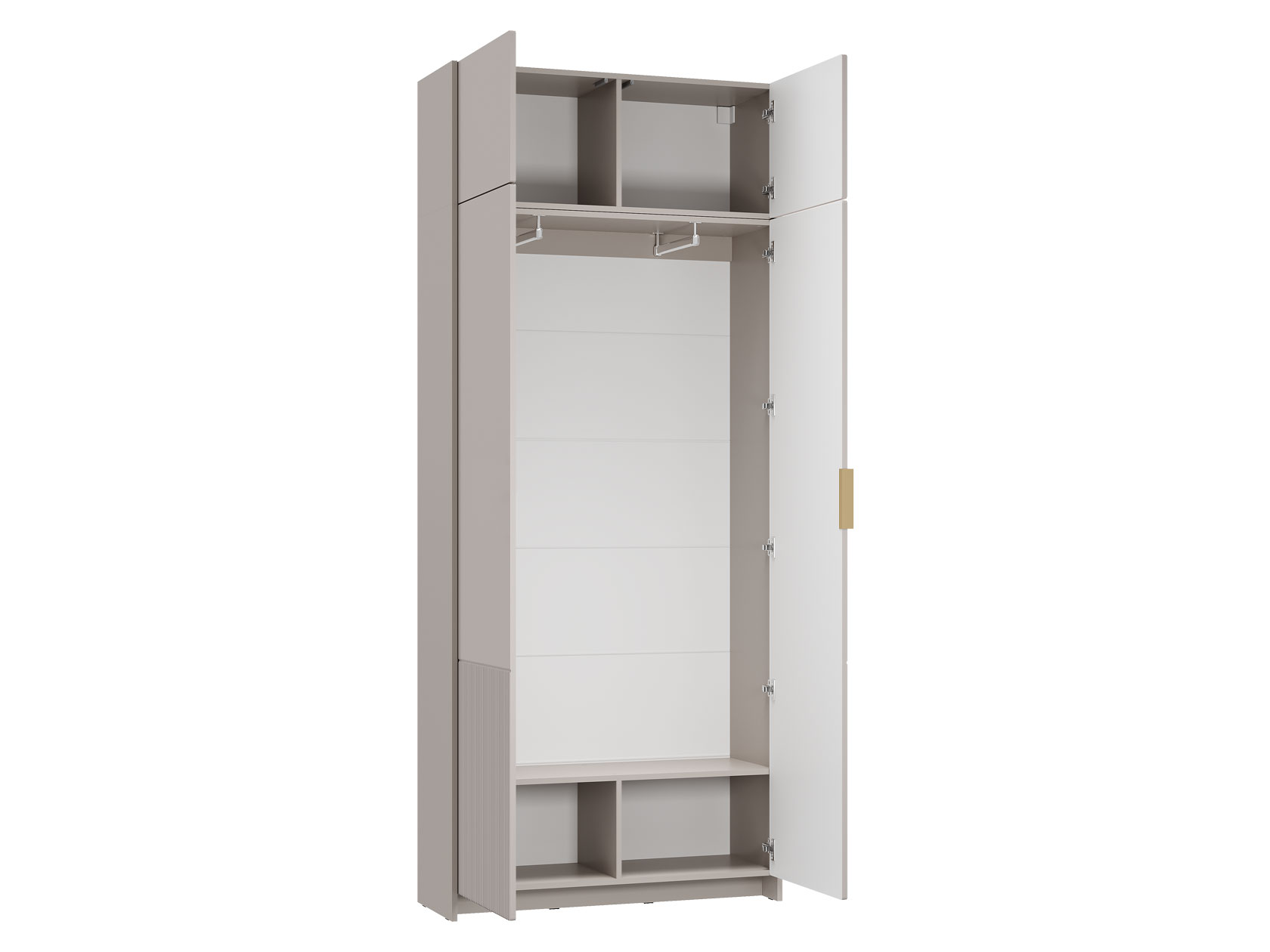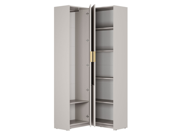 Прихожая Пандора Дуо предоставляет обширное и удобное пространство для хранения одежды и аксессуаров. За глухими фасадами находятся отделения для одежды на вешалках и полки. Открытые ниши идеально подходят для сложенных вещей и сумок. Рифленые фасады и стильные золотистые ручки придают обстановке современный и уютный вид.