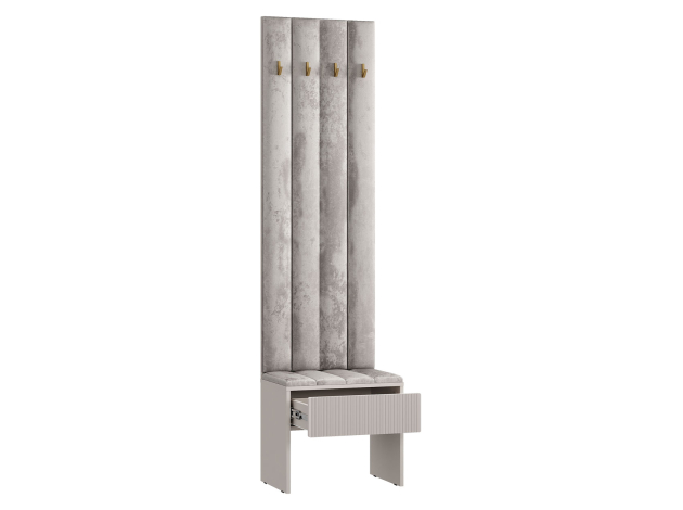 Прихожая Пандора Миди создаст уютную атмосферу, сделав ежедневные сборы комфортным ритуалом. Сочетание глухих фасадов и открытых ниш позволяет грамотно организовать хранение и придает интерьеру визуальную легкость. Мягкая скамейка станет удобным местом для переобувания. Антресольные секции обеспечат пространство для вещей, которые требуются редко. Фрезеровка на фасадах и лицевая фурнитура в золотом оттенке придают мебели привлекательный вид.