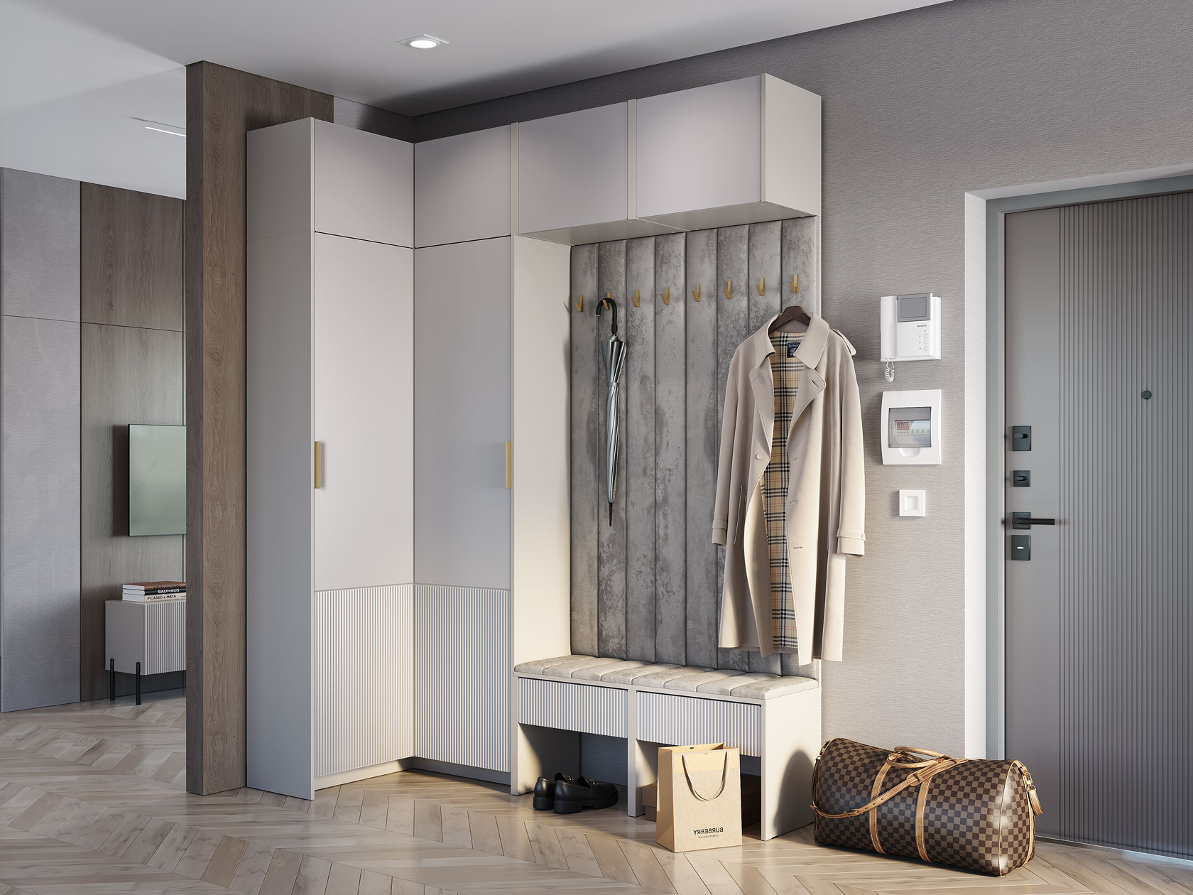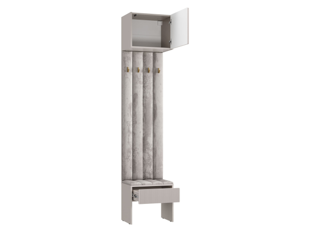 Прихожая Пандора Софт — практичное решение для небольшой квартиры. Удобная конфигурация элементов позволяет расположить все необходимые вещи и создать порядок даже на ограниченной площади. Просторный угловой шкаф подойдет для хранения сезонных предметов гардероба. Антресольные секции обеспечат место для коробок и вещей, которые требуются редко. Открытая вешалка с крючками и мягкой отделкой идеально подойдет для курток и пальто, а также станет акцентом меблировки.