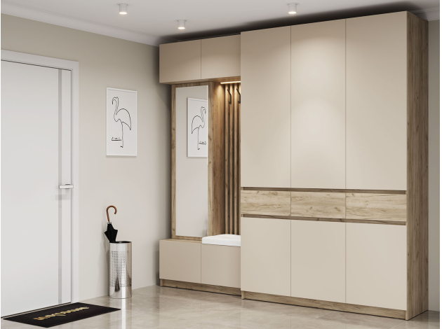 Прихожая Бостон идеально подойдет для хранения предметов гардероба и различных мелочей. Наполнение представлено множеством полок, выдвижными ящиками, нишами за распашными дверцами и отделением с продольной штангой. Мягкое сиденье позволит удобно переобуваться, а высокое зеркало — оценить свой образ перед выходом из дома.