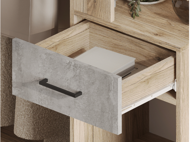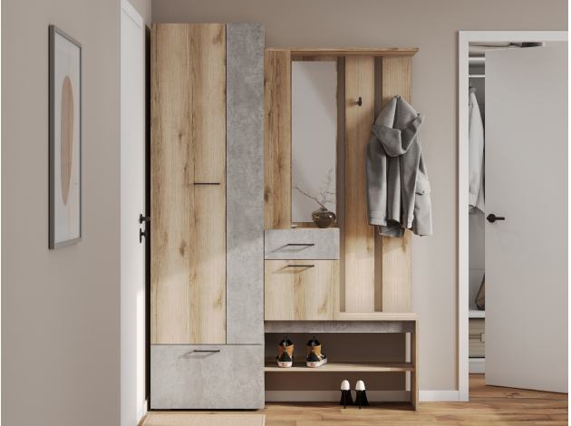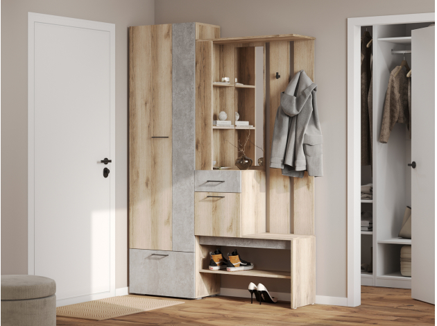 Прихожая Лидер идеально впишется в современный интерьер в стиле лофт. Светлые оттенки внесут легкость в пространство комнаты, а практичное наполнение позволит разместить все необходимые вещи и обувь.