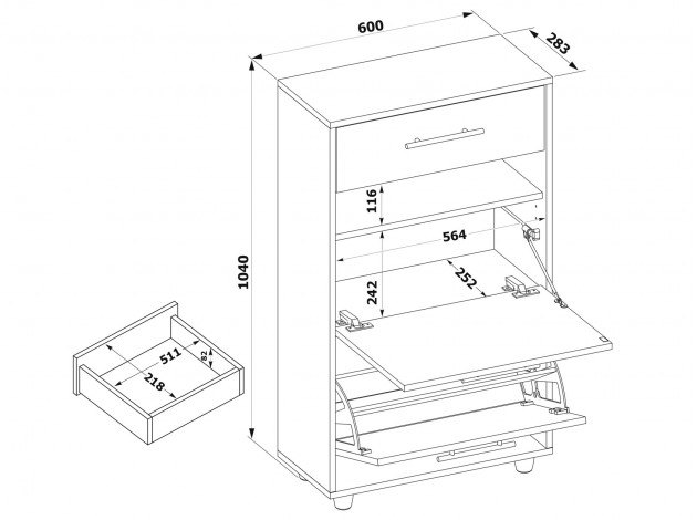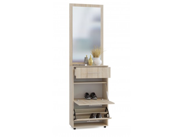 Маленькая прихожая в коридор Моренго 4 включает в себя зеркальную панель и вместительную тумбу для обуви. Верхний выдвижной ящик вместит всё, что нужно взять с собой, выходя их дома. Средняя дверь оснащена откидывающимся механизмом со специальными полками для размещения обуви, который обеспечивает удобство хранения и легкий доступ к необходимой паре кроссовок или туфель. Нижняя дверь скрывает вместительный ящик для высокой обуви.