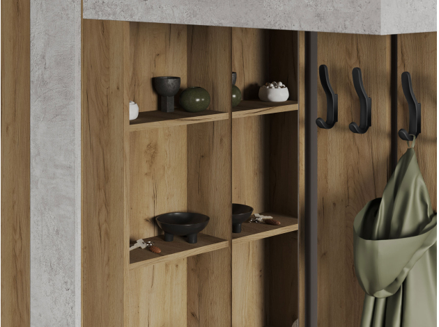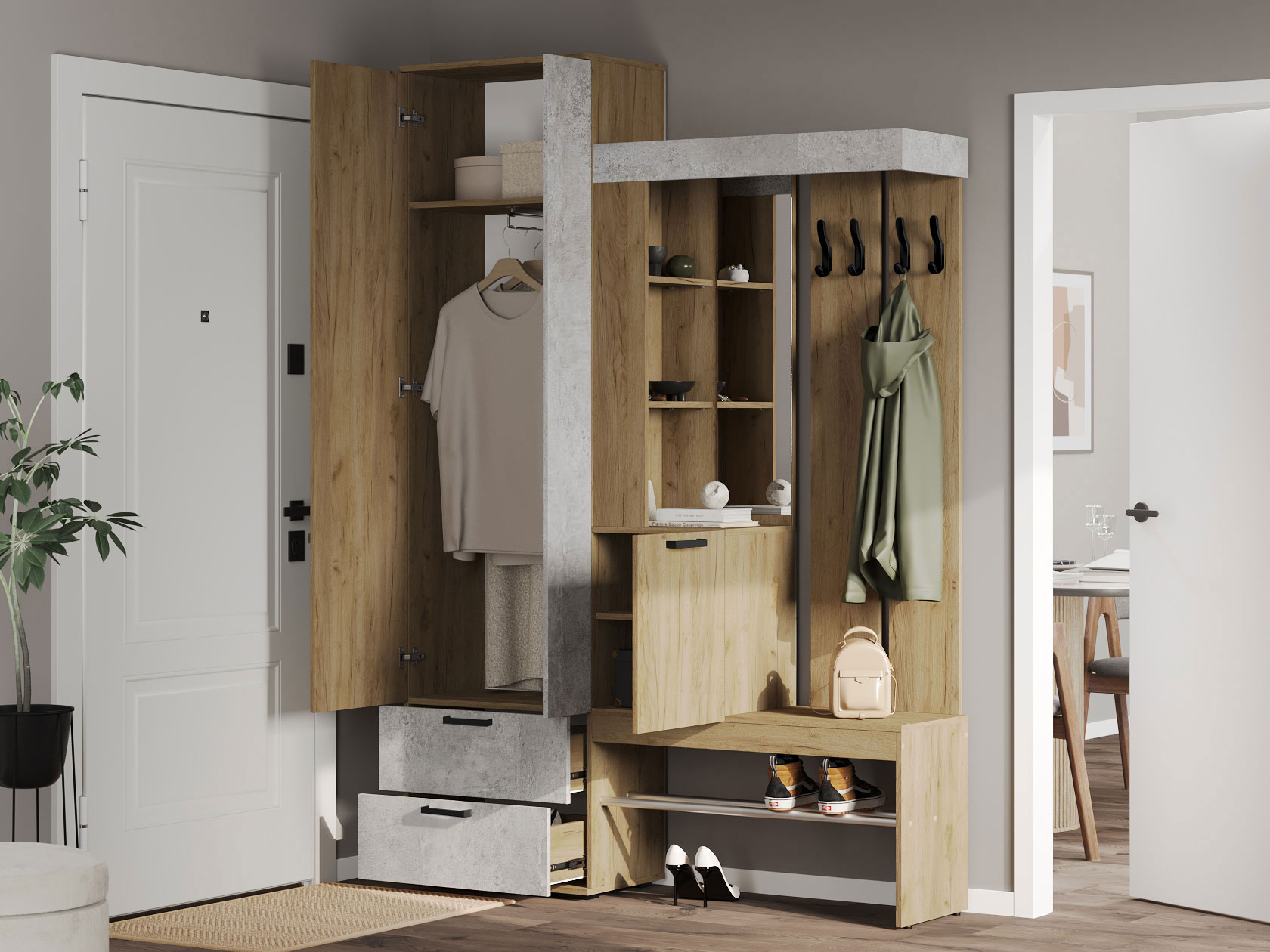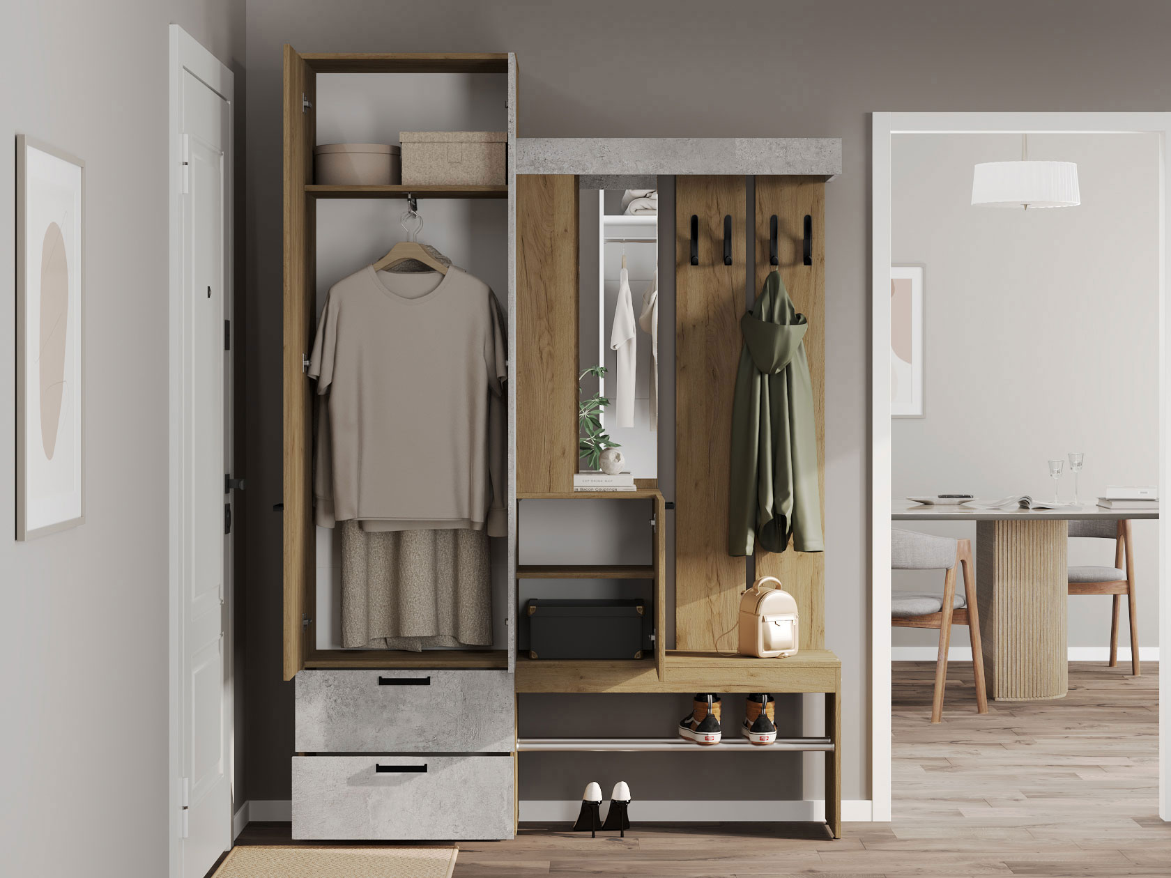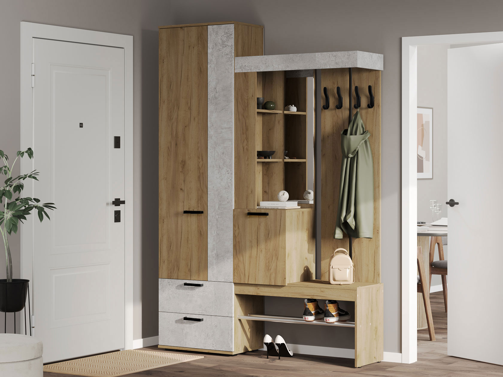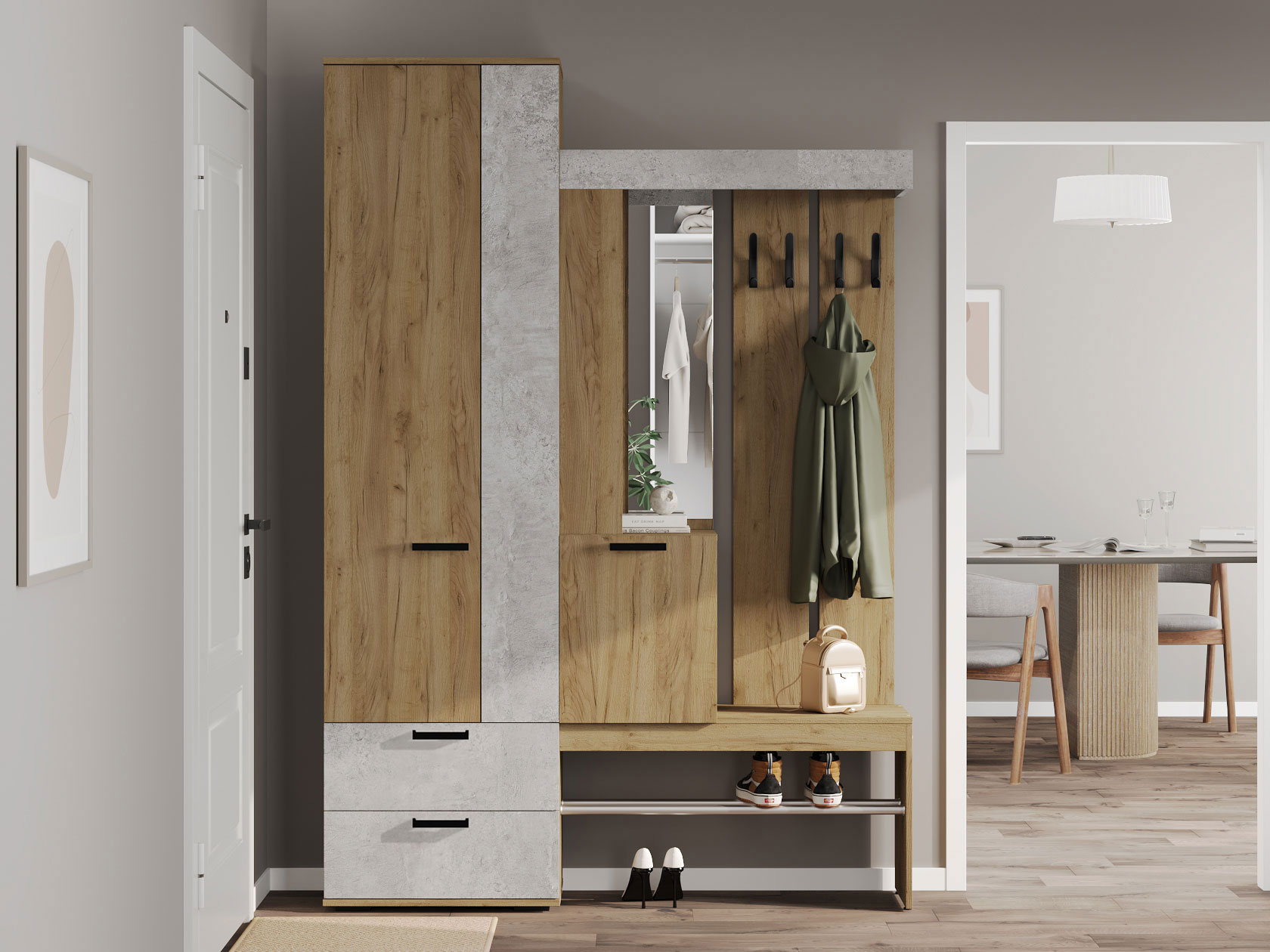 Прихожая Трамп придется по душе ценителям стиля лофт. Оригинальное цветовое решение, четкость и лаконичность линий, богатое наполнение — в этой модели есть всё, чтобы занять достойное место в интерьере. Прихожая очень функциональна, что позволит распределить все необходимые вещи, сохранив при этом жилое пространство.