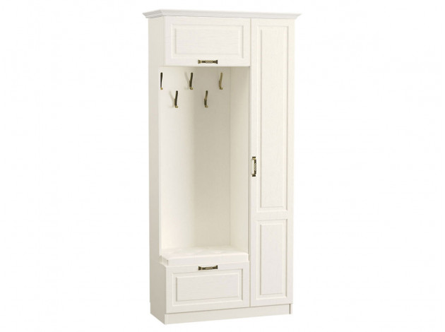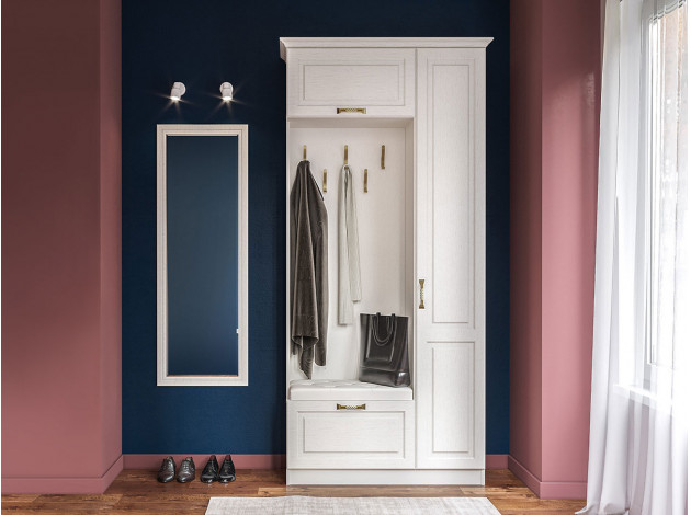 Прихожая Ливерпуль выполнена в стиле современной классики и поможет создать функциональную и эстетичную обстановку в квартире или загородном доме. Для верхней одежды предусмотрены расположенные на разных уровнях удобные крючки, а для обуви есть специальная тумба с откидной дверцей. Система хранения дополнена закрытыми полками, где найдется место для аксессуаров, головных уборов и других вещей.