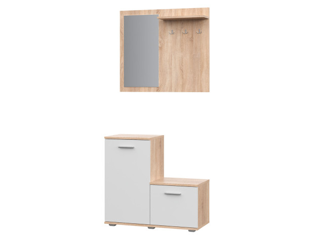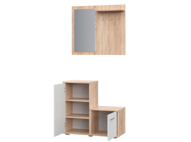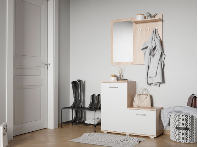 Прихожая Рио органично дополнит как просторную, так и небольшую входную зону. Две тумбы для обуви позволят оптимально использовать площадь прихожей и послужат в качестве подставок для сумок, аксессуаров и уютных мелочей. Настенная панель с зеркалом и крючками поможет разместить одежду, а также оценить внешний вид перед выходом из дома.
