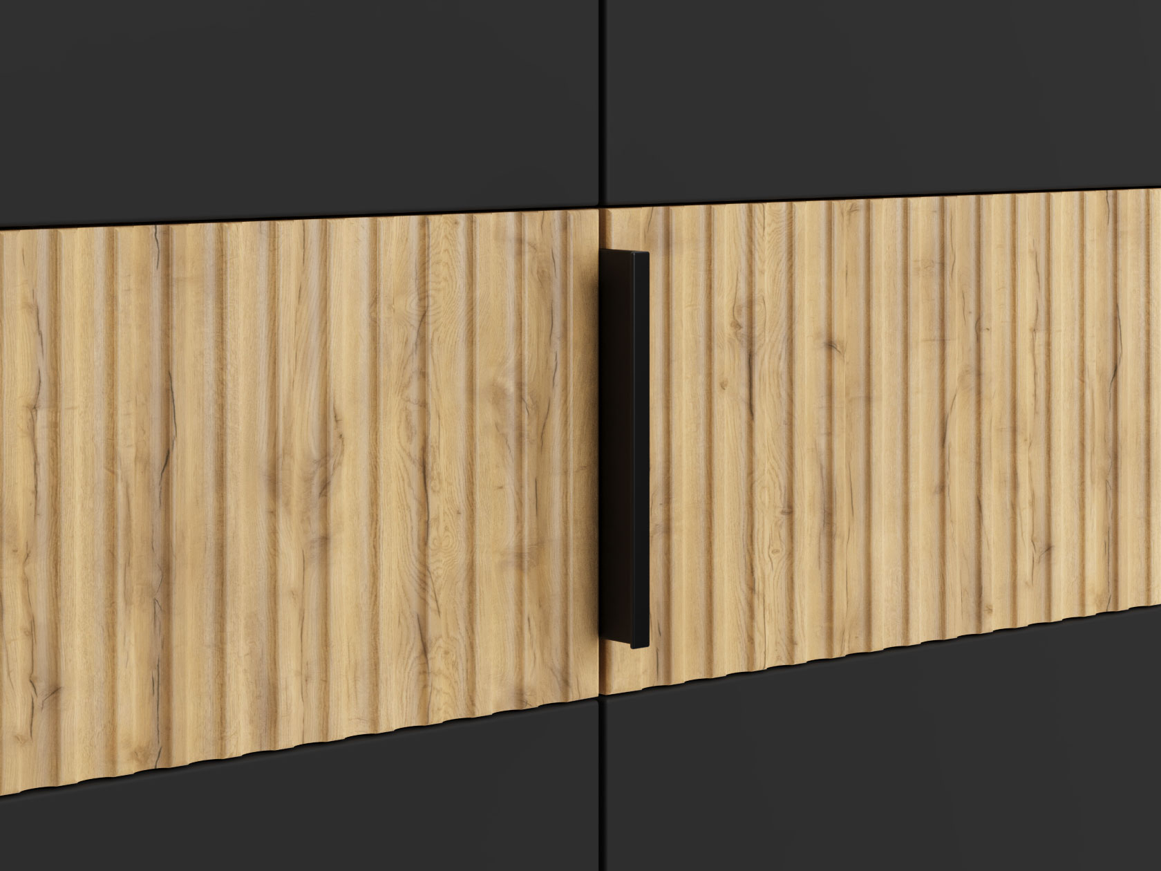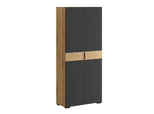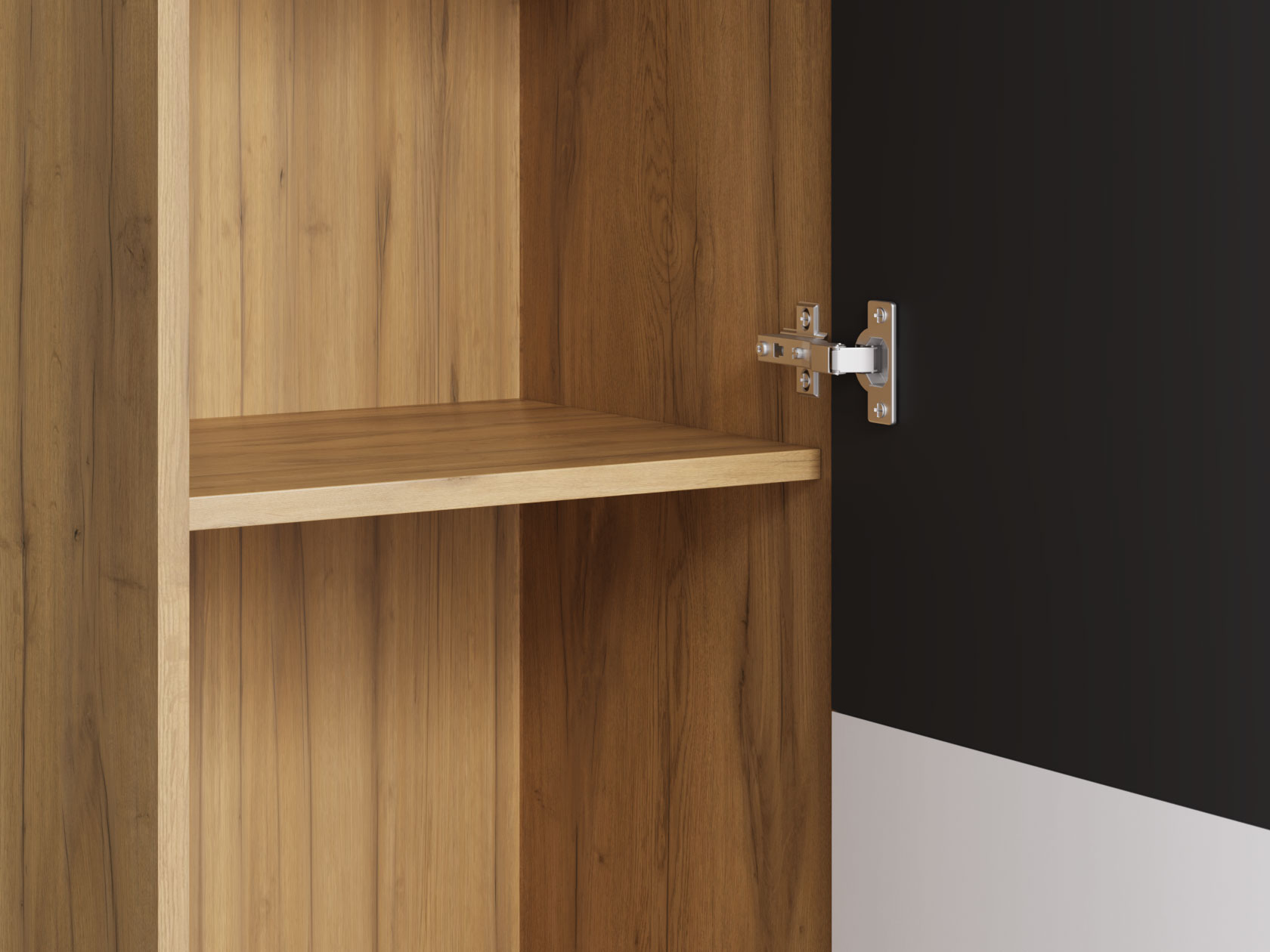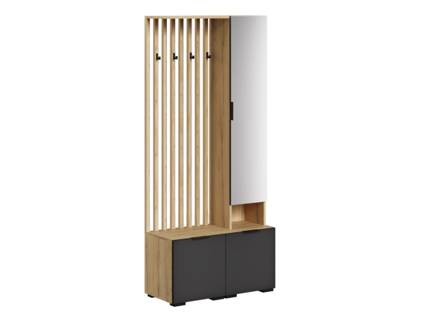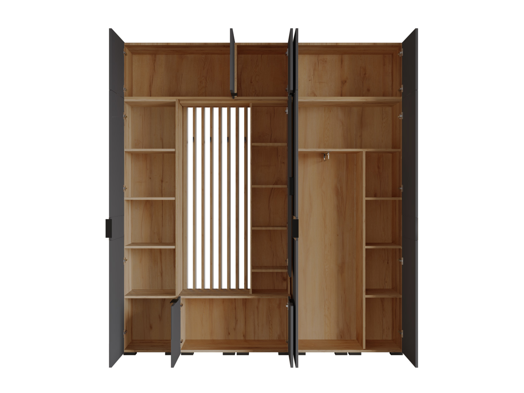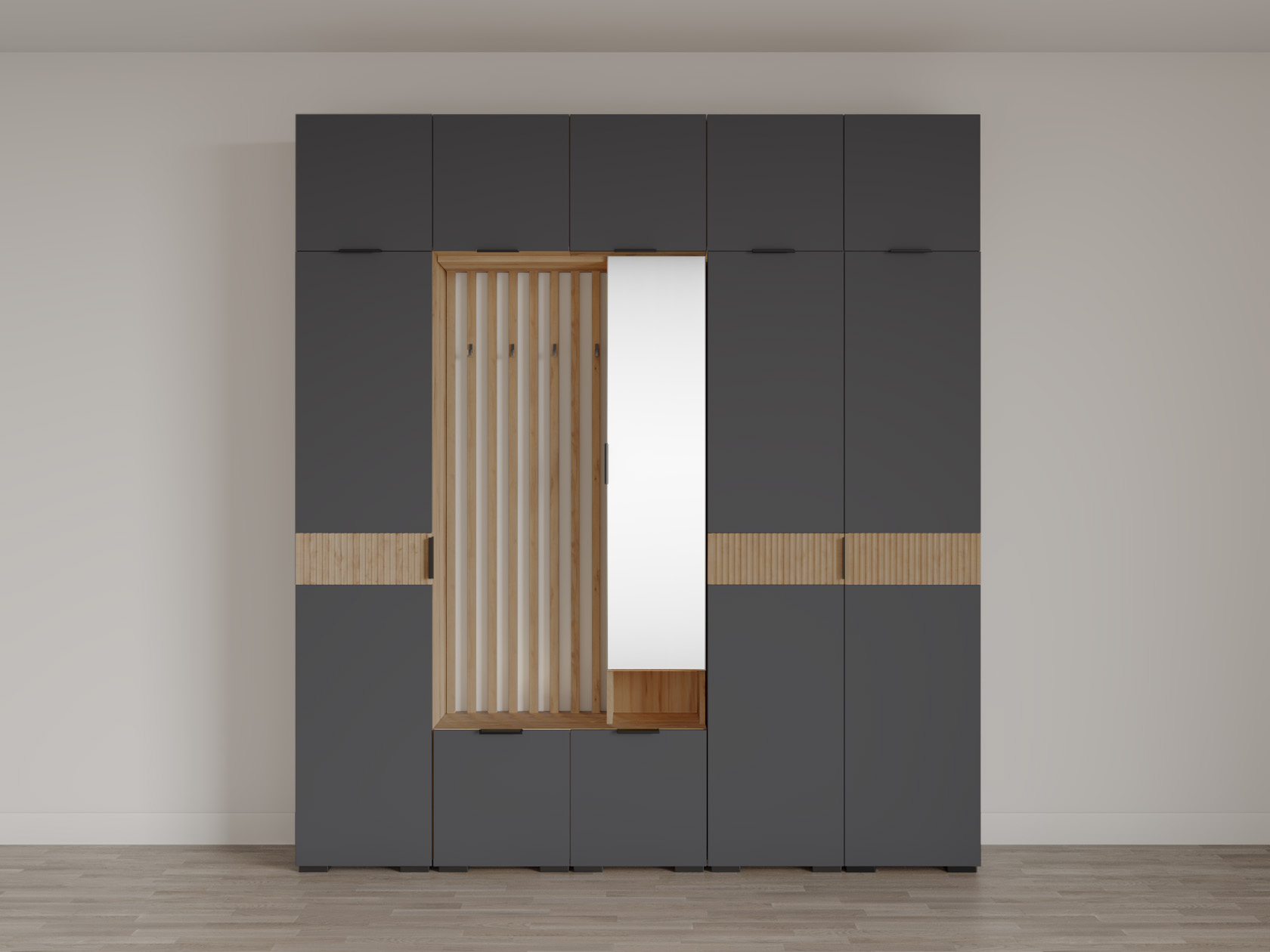 Прихожая Роби обустроит входную зону в квартире, решив вопрос с местами для аккуратного хранения вещей. Закрытая система предусматривает ансамбль напольных и навесных шкафов. Открытая зона подойдет для создания порядка среди верхней одежды и головных уборов. Вставки на фасадах с изящной вертикальной фрезеровкой придают мебели оригинальный вид.
