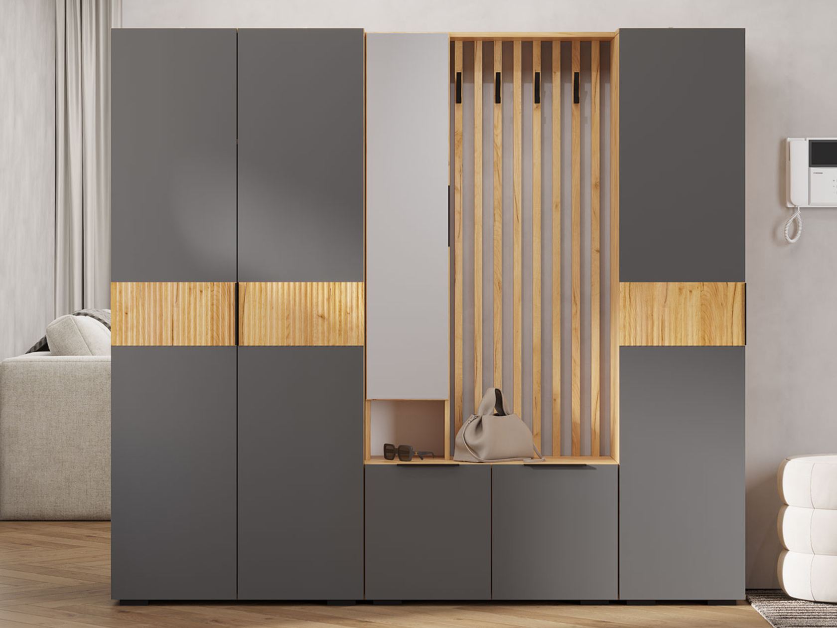 Прихожая Сандра Стандарт поможет практично обустроить пространство при входе в квартиру. Закрытые отделения обеспечат удобное хранение сезонной одежды и сопутствующих аксессуаров. Открытая вешалка с крючками и тумба разместят повседневные вещи и обувь. Матовые фасады удачно дополнены вставками с фрезеровкой, что создает уютную атмосферу.