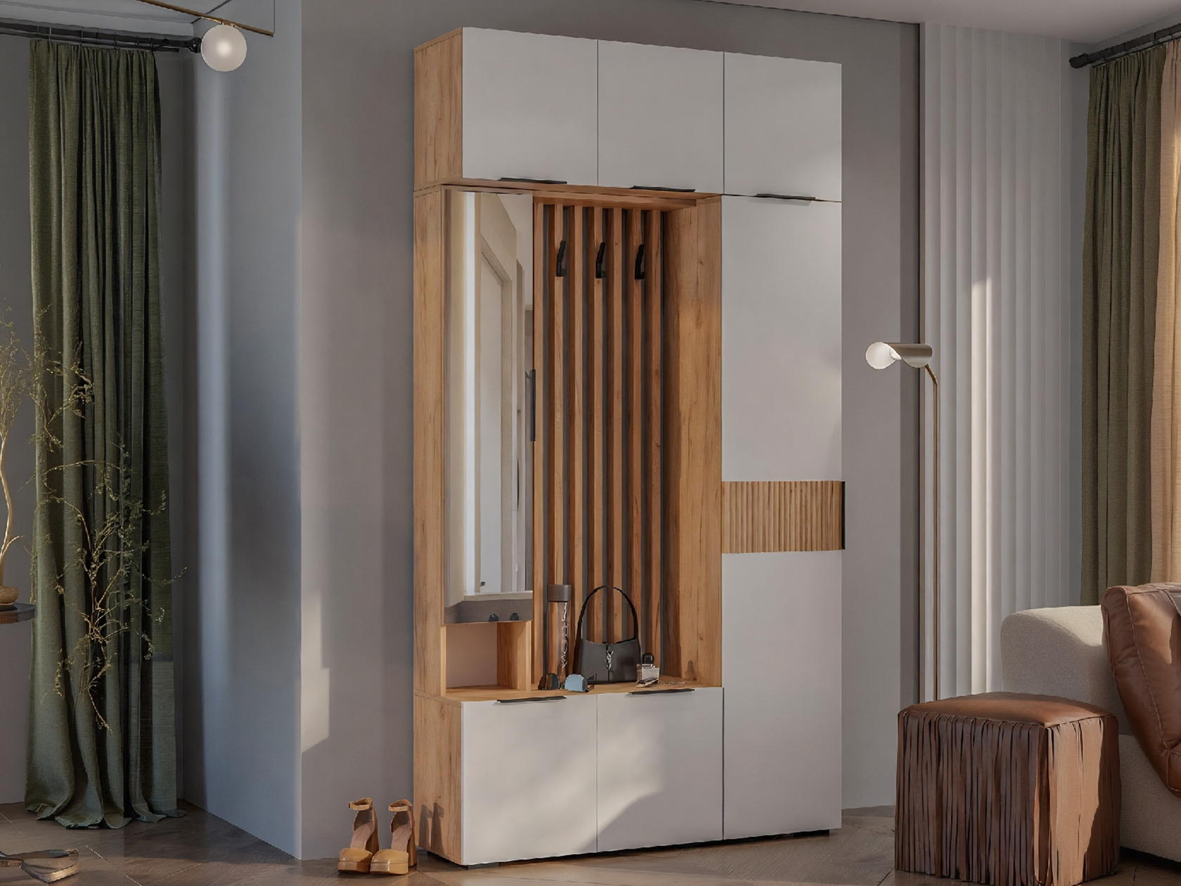 Прихожая Сандра Миди идеально подойдет для небольшой квартиры. Функциональный набор элементов позволит для каждой вещи найти свое место. Антресольная секция поможет распределить сезонную одежду, а открытая вешалка — держать под рукой то, что требуется каждый день. Текстура дерева добавляет интерьеру нотки теплоты и уюта.
