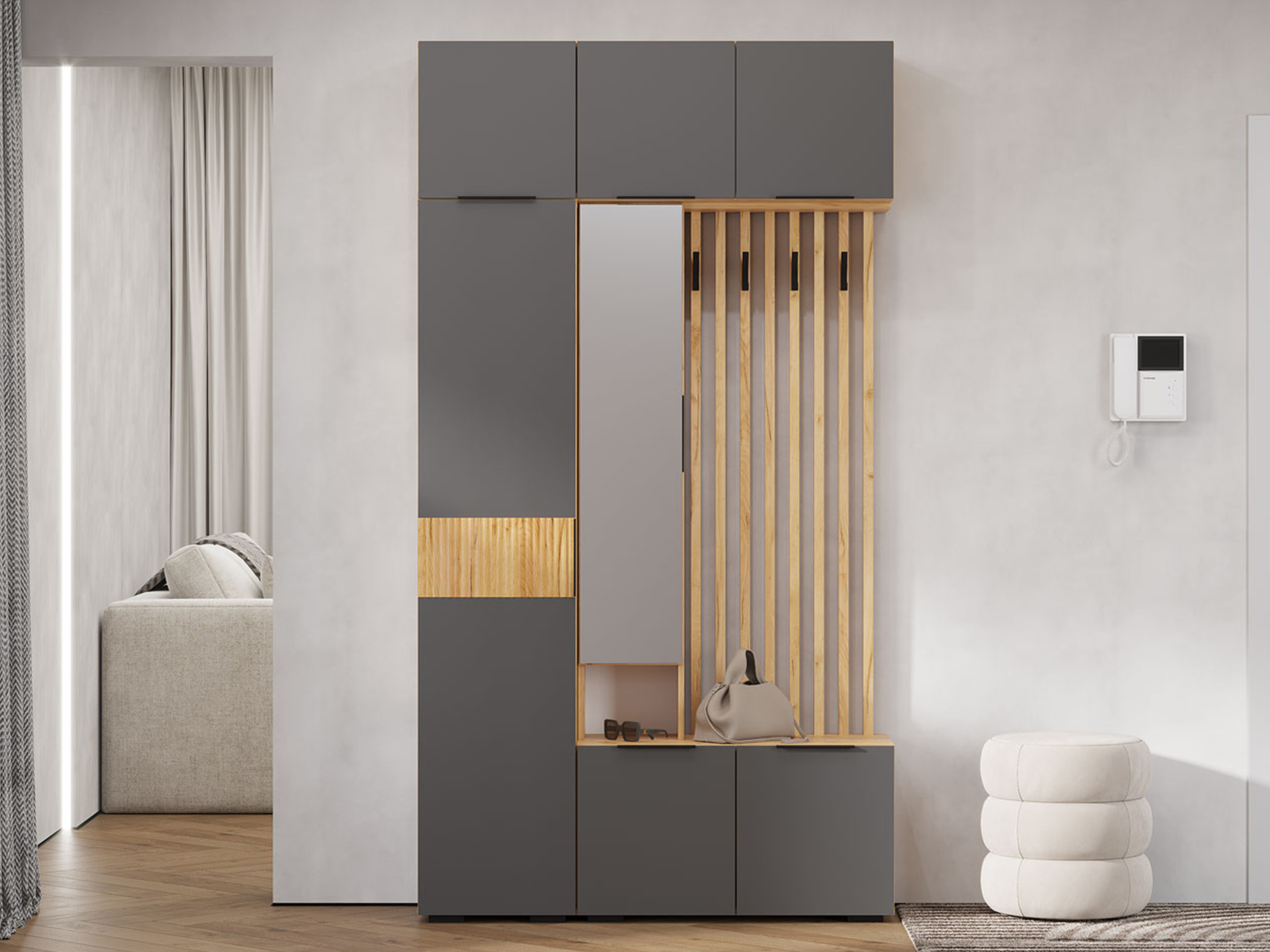 Прихожая Сандра Миди идеально подойдет для небольшой квартиры. Функциональный набор элементов позволит для каждой вещи найти свое место. Антресольная секция поможет распределить сезонную одежду, а открытая вешалка — держать под рукой то, что требуется каждый день. Текстура дерева добавляет интерьеру нотки теплоты и уюта.