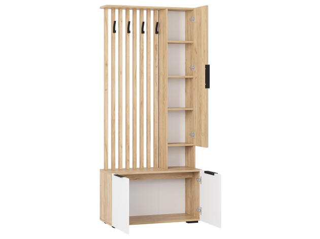 Прихожая Сандра Мини поможет оптимально использовать доступное пространство. В распашном шкафу найдется место для сложенных предметов гардероба, аксессуаров и важных мелочей, а на вешалке — повседневной одежды и сумок. Сочетание матовых фасадов и текстуры дерева актуально смотрится в современном интерьере.