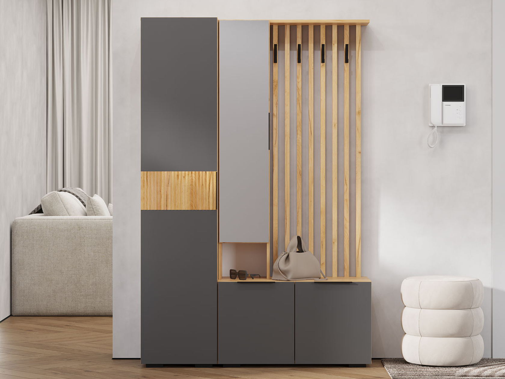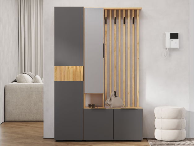 Прихожая Сандра Мини поможет оптимально использовать доступное пространство. В распашном шкафу найдется место для сложенных предметов гардероба, аксессуаров и важных мелочей, а на вешалке — повседневной одежды и сумок. Сочетание матовых фасадов и текстуры дерева актуально смотрится в современном интерьере.
